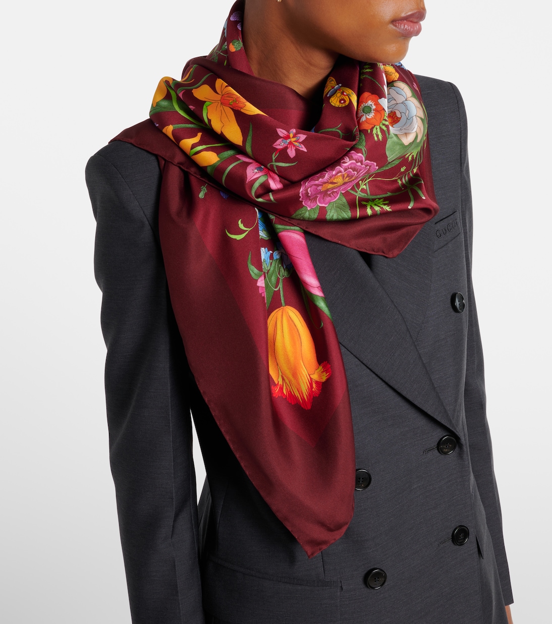 Этот квадратный шарф Gucci выполнен из блестящей шелковой саржи. Принт Gucci Flora украшает этот бордовый шарф, придавая вашему образу яркие яркие нотки.