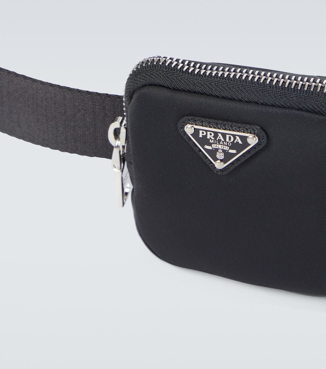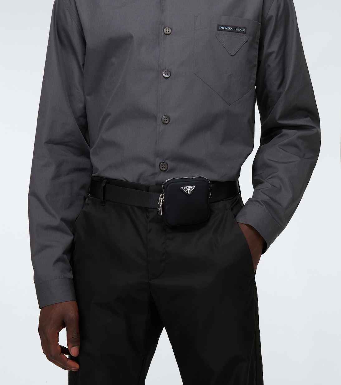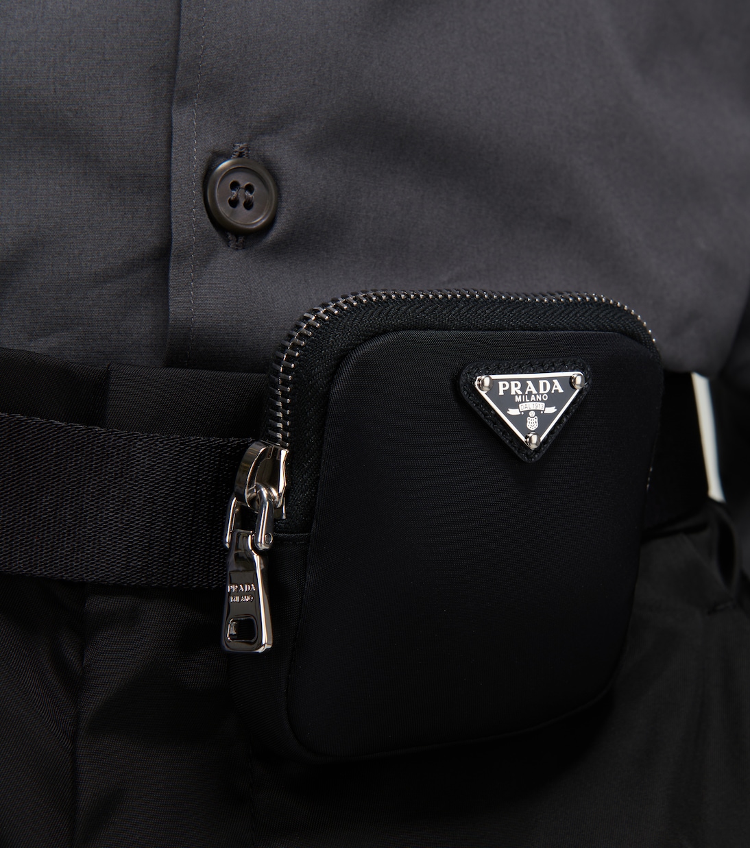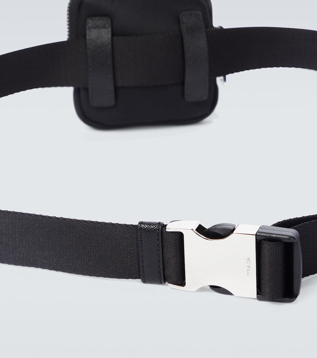 Этот ремень Prada, сотканный из фирменного нейлона бренда черного цвета, оснащен серебристой металлической пряжкой, съемным мешочком и отделкой из черной кожи Saffiano.