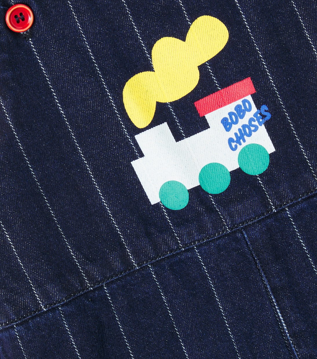 Джинсовый комбинезон Bobo Choo Choo от Bobo Choses с контрастными тонкими полосками, очаровательным принтом и застежкой на пуговицы. Изделие изготовлено из хлопка, сертифицированного по стандарту GOTS, что означает соответствие производственного процесса строгим социальным и экологическим стандартам.