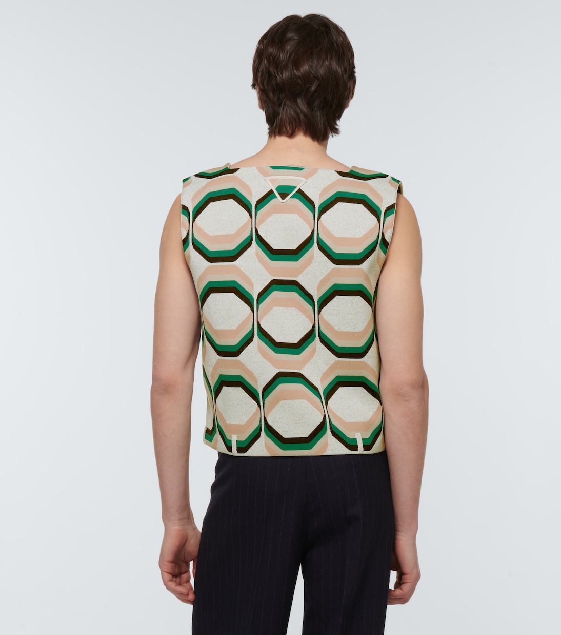 Этот структурированный жилет от Prada соткан из технического материала с характерным квадратным вырезом и геометрическим узором в оттенках зеленого, коричневого и розового.