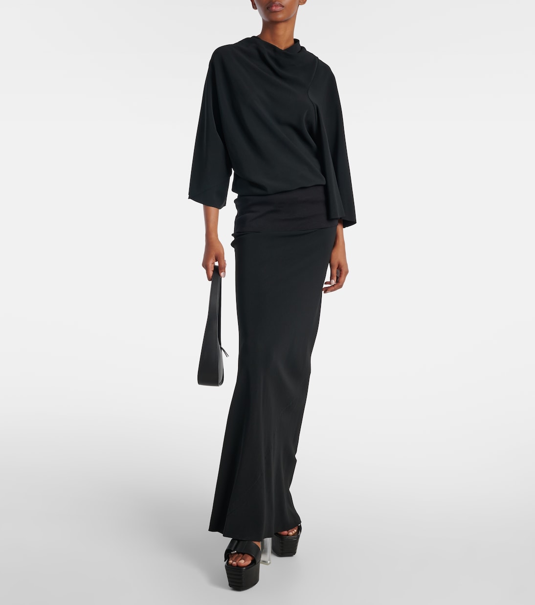 Этот топ Rick Owens воплощает фирменную эстетику бренда: смелый, архитектурный и изысканный. Изделие с драпированным силуэтом и рукавами до локтя выполнено из шармеза, что придает ему элегантный вид.