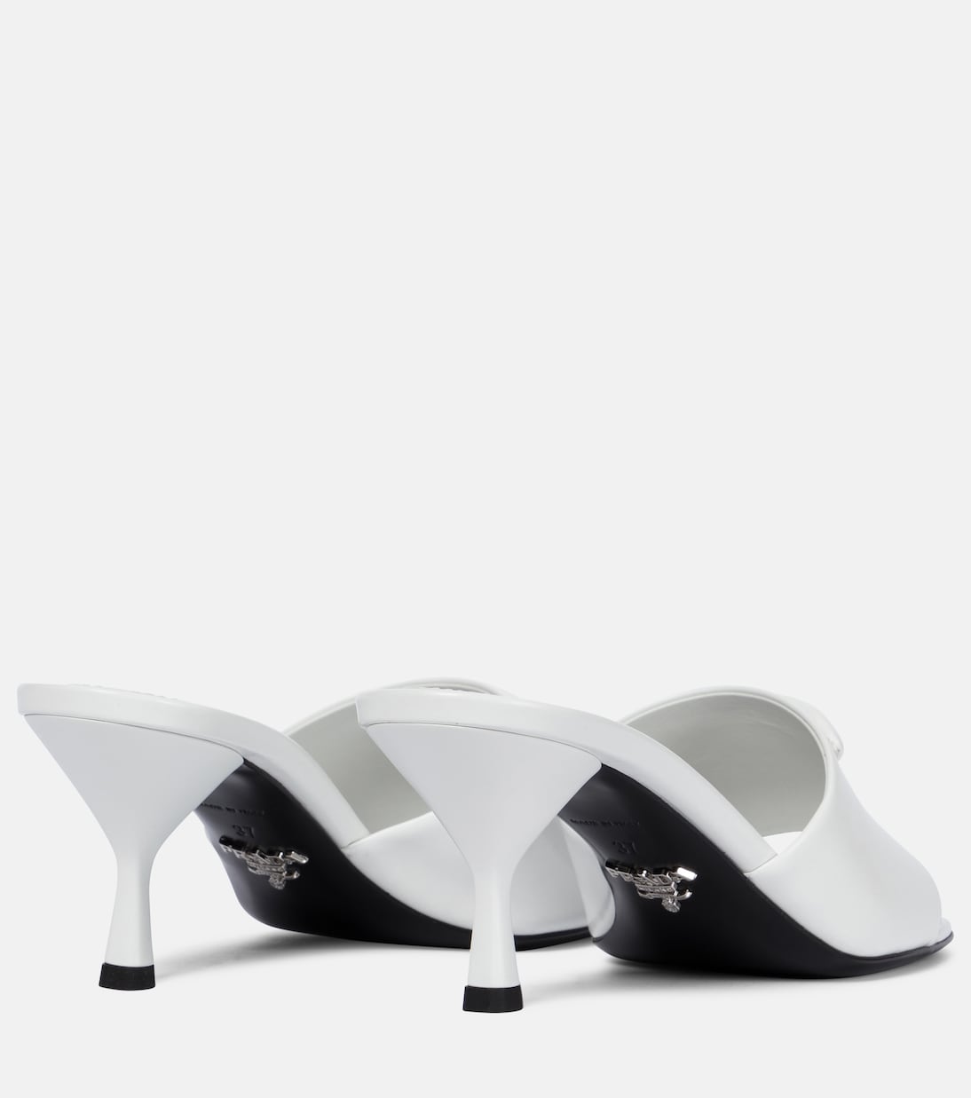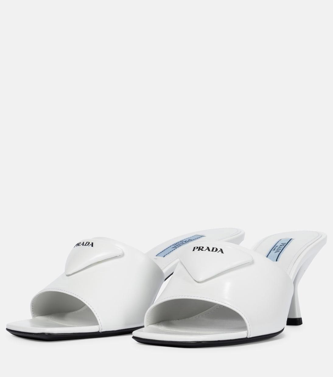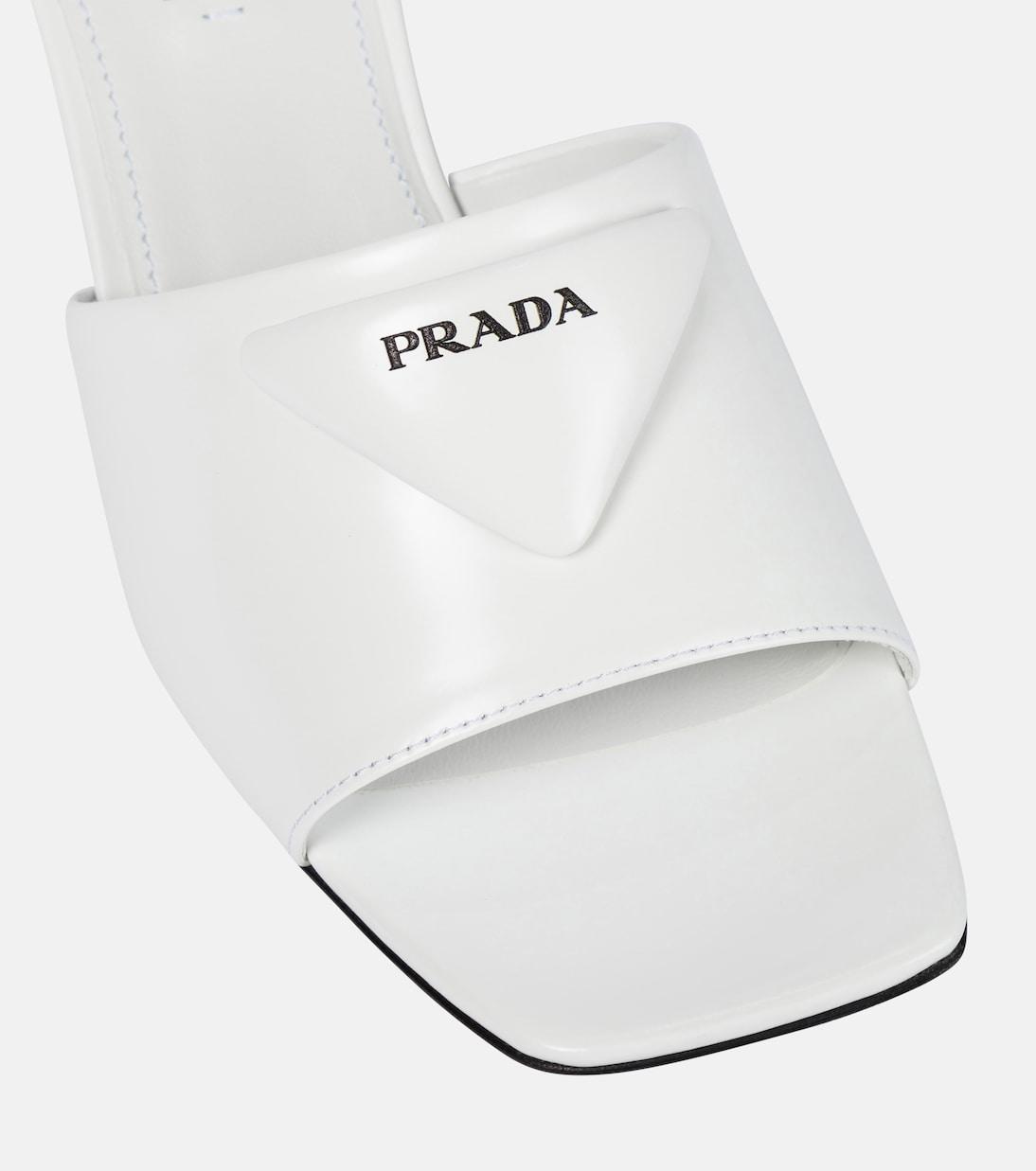 Пусть ваши ступни говорят о вашей преданности Prada в этих полированных босоножках-мюлях. Они изготовлены из шлифованной кожи в оптически-белом цвете, украшены мягкими треугольными логотипами и установлены на расклешенном каблуке высотой 65 мм. Сочетайте их с непринужденными костюмными вещами.