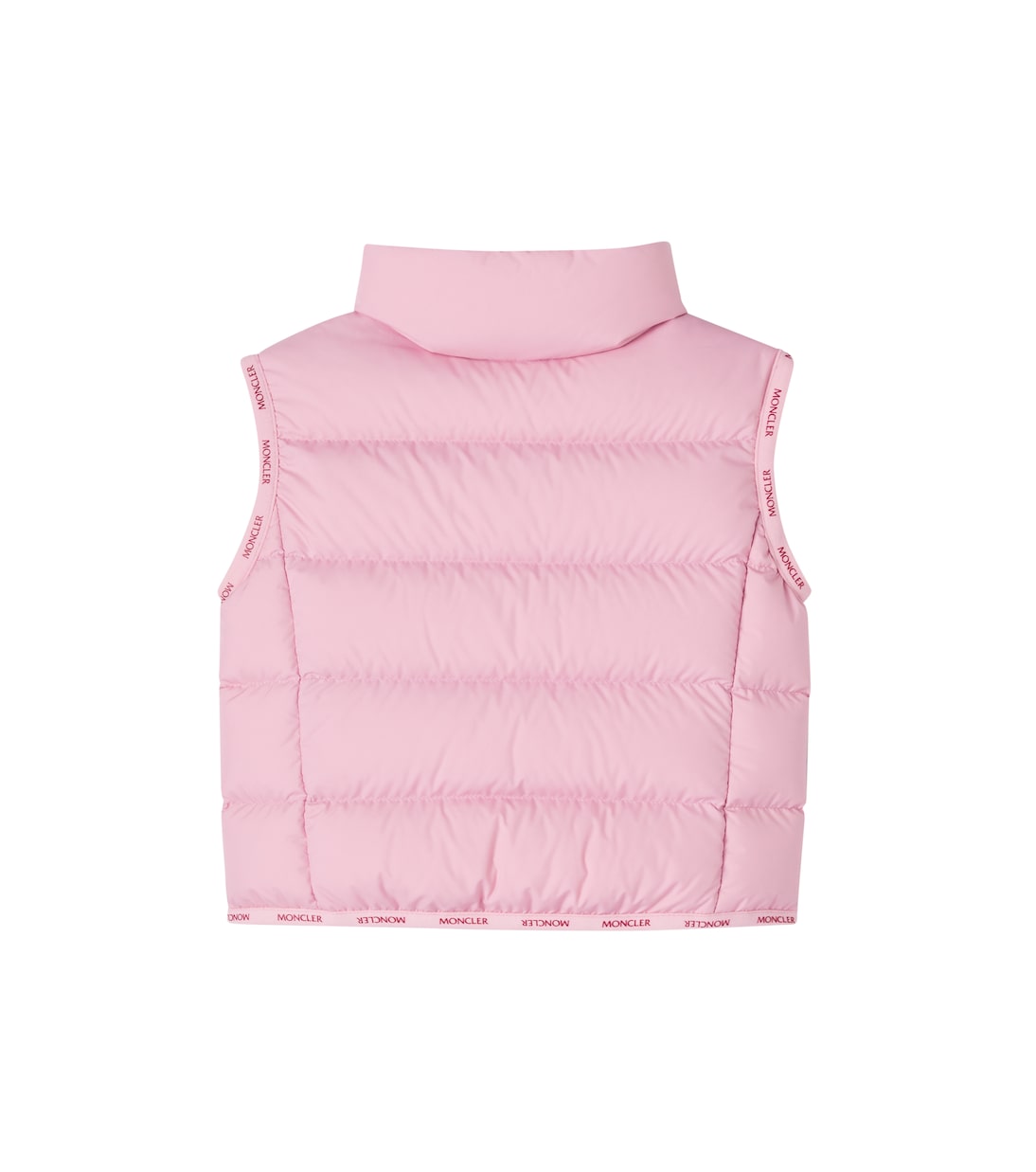 Пуховой жилет Badia имеет застежку на кнопки спереди и карманы. Утепляющие модели Moncler Enfant с пуховым наполнителем поставляются поставщиками, сертифицированными DIST, в качестве побочного продукта пищевой промышленности.