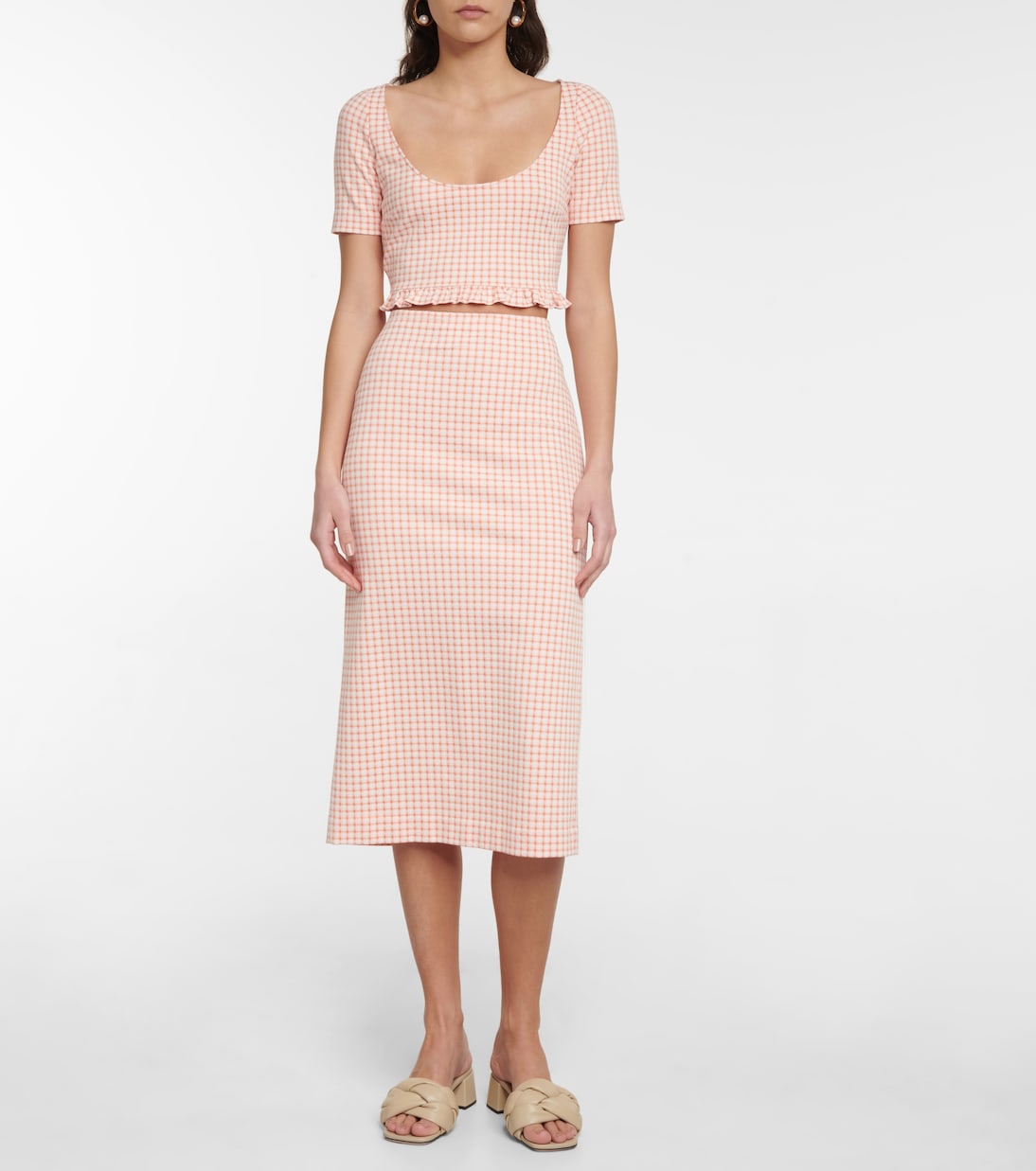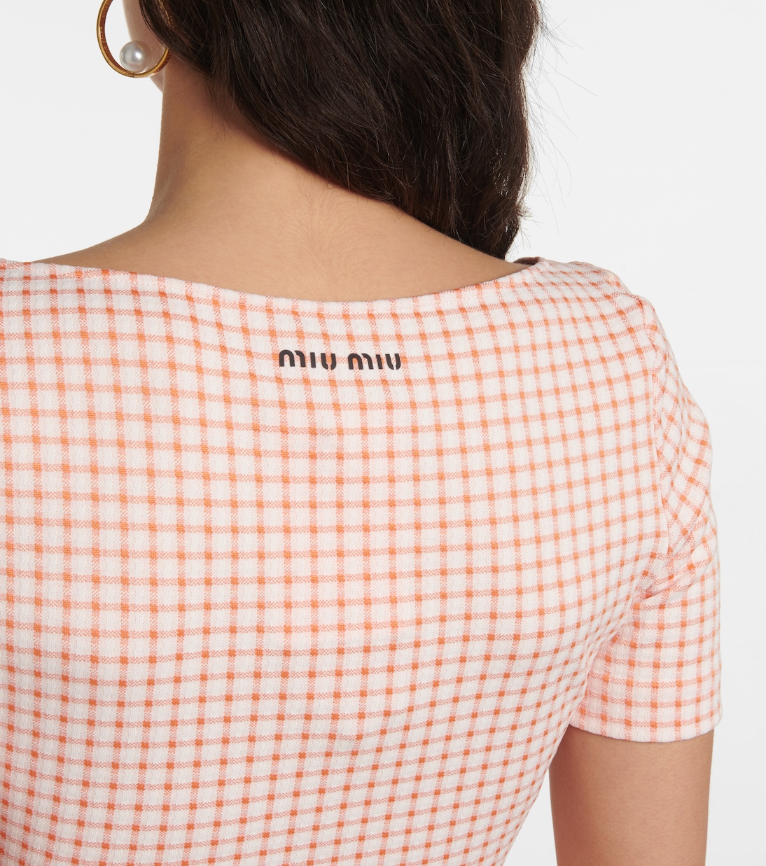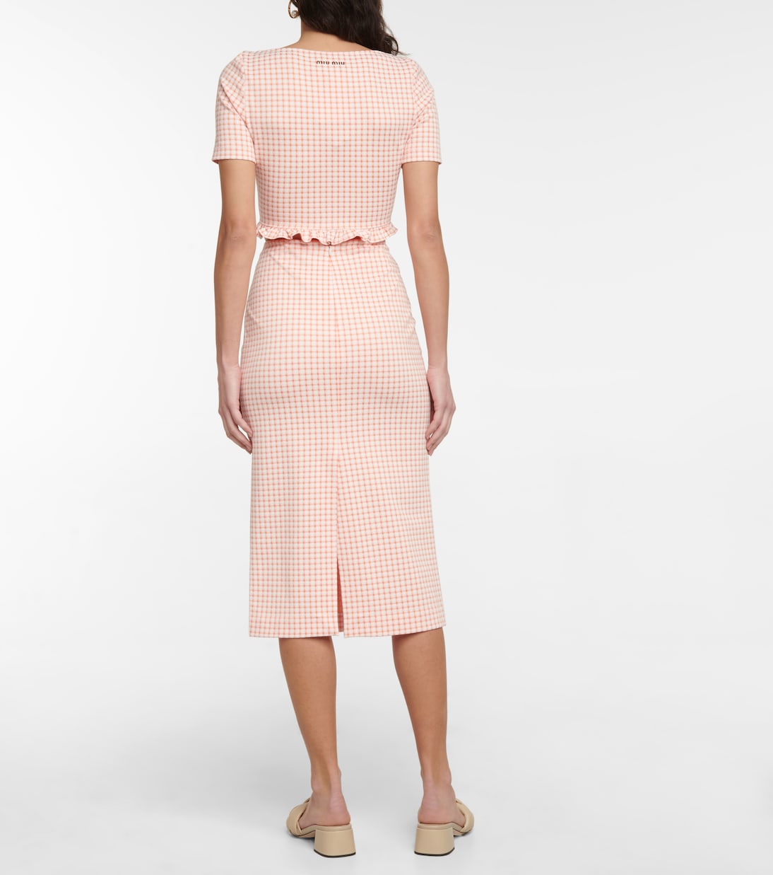 Этот укороченный топ Miu Miu с глубоким круглым вырезом и оборкой по подолу. Дополните его юбкой-карандашом в тон, чтобы создать идеальный летний образ.
