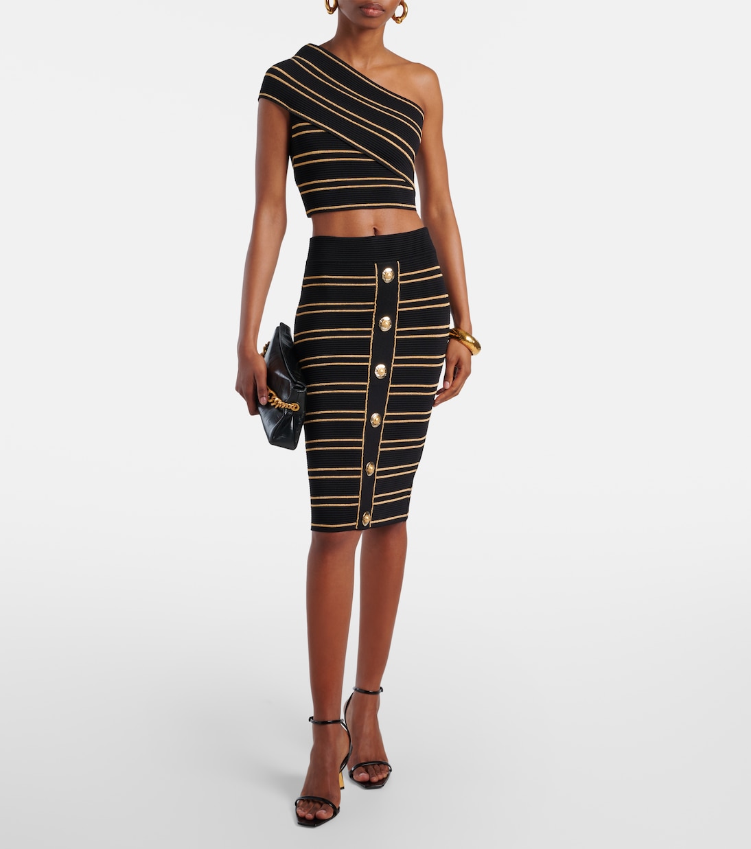 Этот укороченный топ от Balmain демонстрирует изящный силуэт, мягко облегающий грудь, создавая стильный образ. Вырез на одно плечо и полосатый узор.