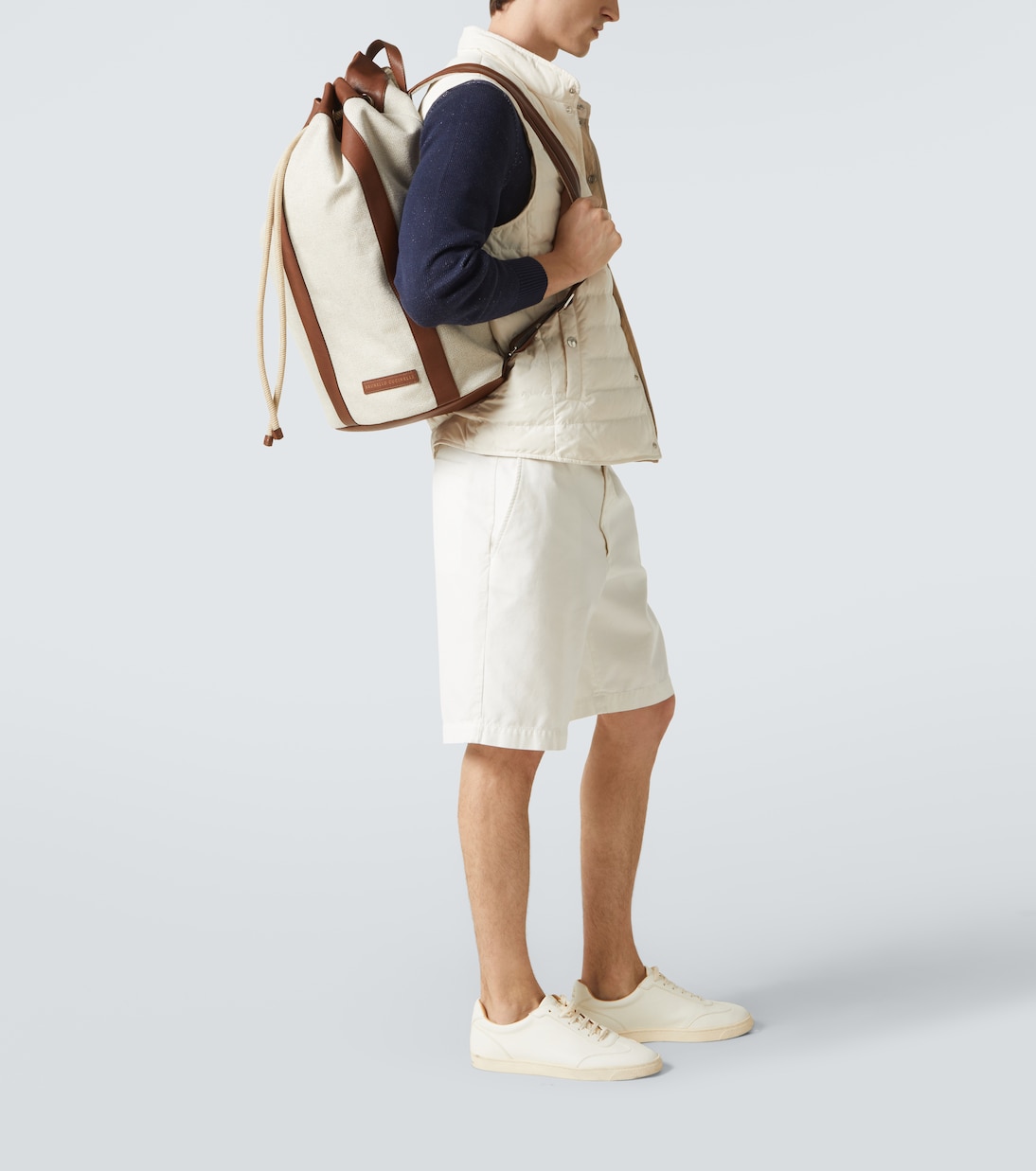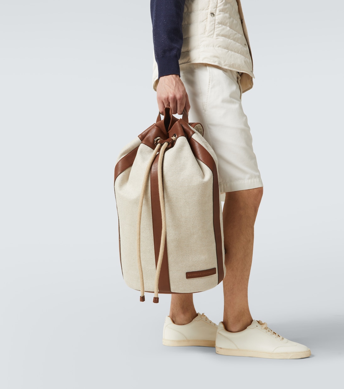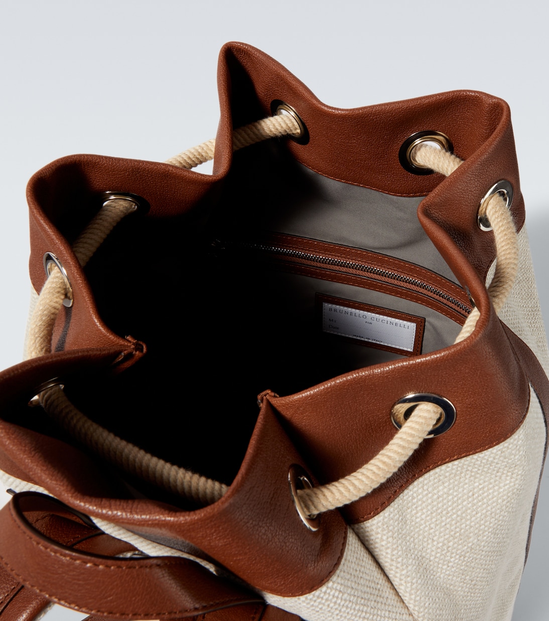Этот холщовый рюкзак от Brunello Cucinelli, произведенный в Италии, имеет затягивающийся шнурок сверху и отделку из кожи. Внутри просторно, есть небольшой карман на молнии.