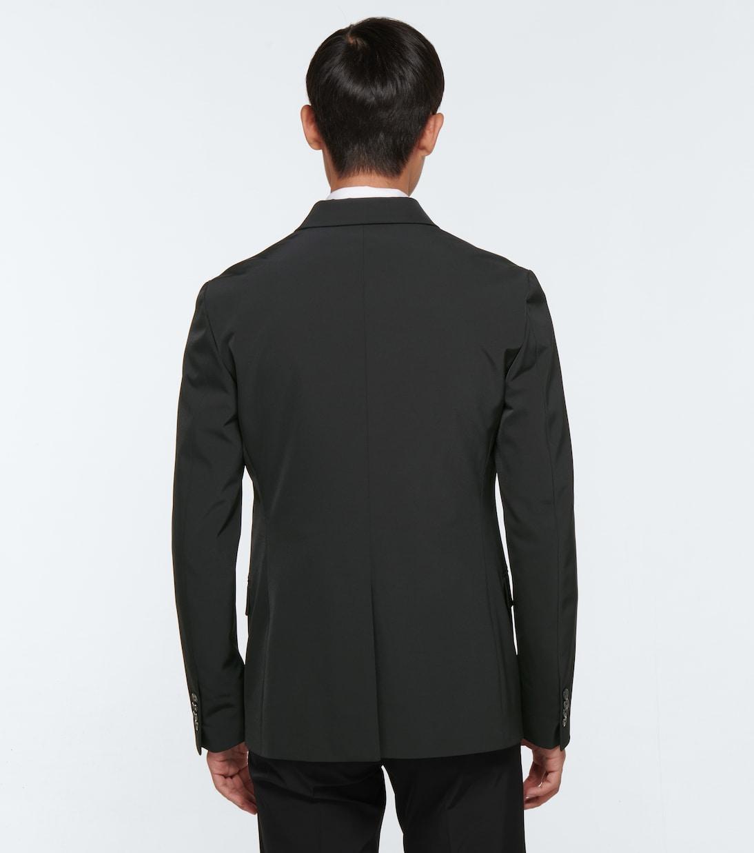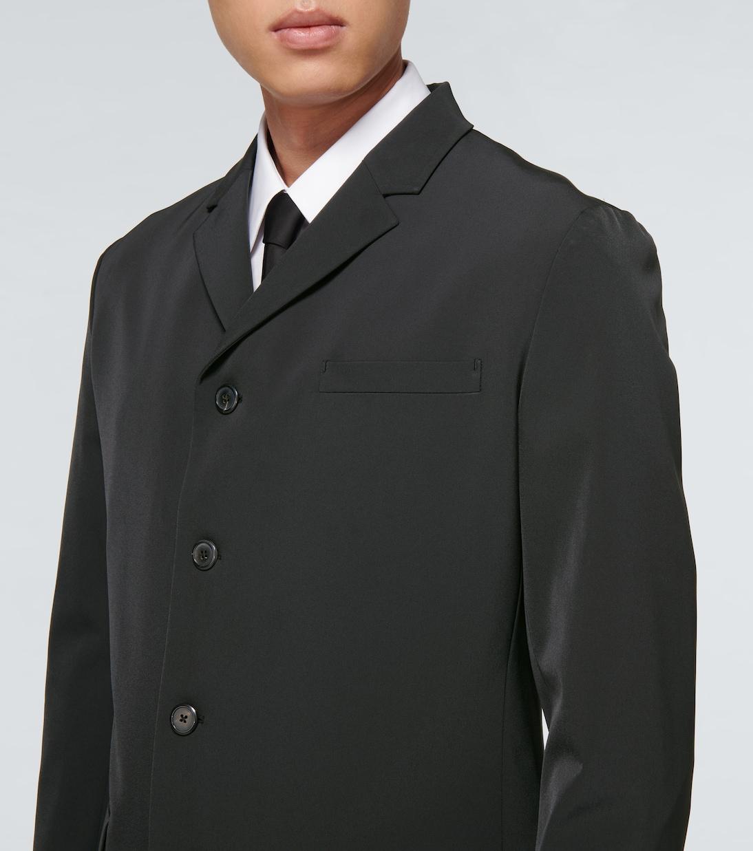 Этот черный технический блейзер от Prada имеет однобортный дизайн, четыре пуговицы спереди, заостренные лацканы и гладкую, свободную посадку.