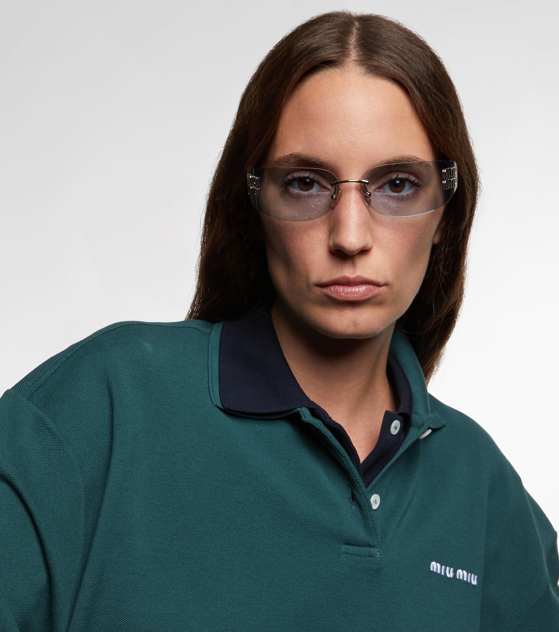 Раскованность, беззаботность и нарочито бунтарский дух — вот отличительные черты Miu Miu от Миуччи Прады. В качестве примера можно привести эти прямоугольные солнцезащитные очки без оправы с чётким названием бренда по бокам.