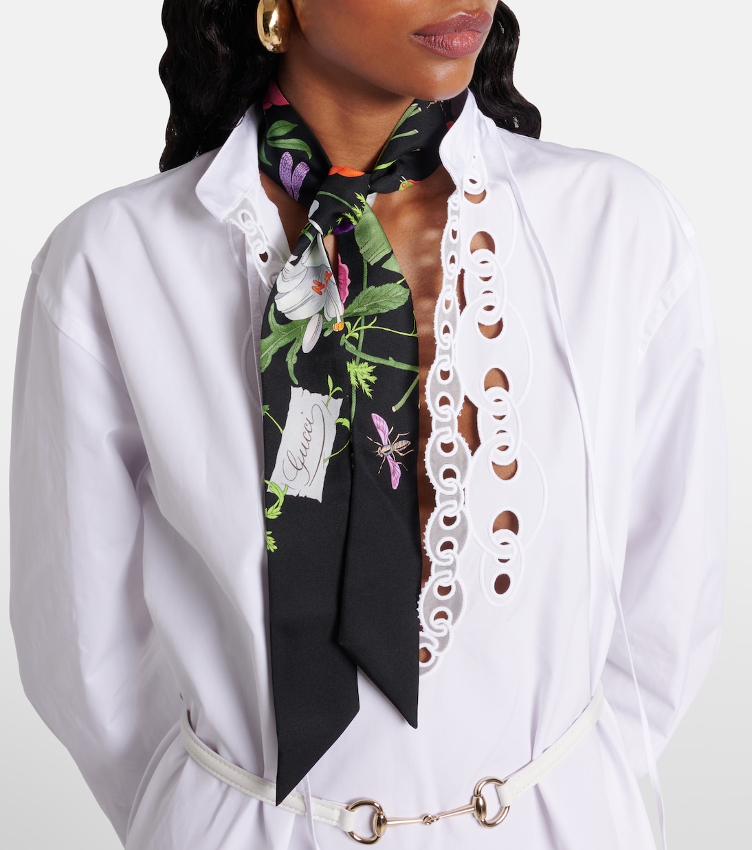 Этот шарф Gucci изготовлен из блестящей шелковой саржи. Принт Gucci Flora украшает этот черный шарф, придавая вашему образу яркие цветочные нотки.