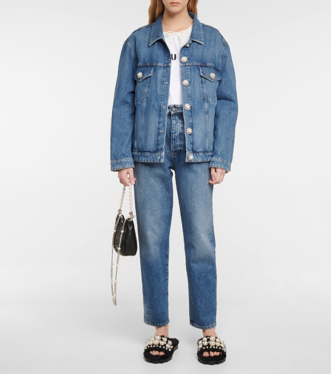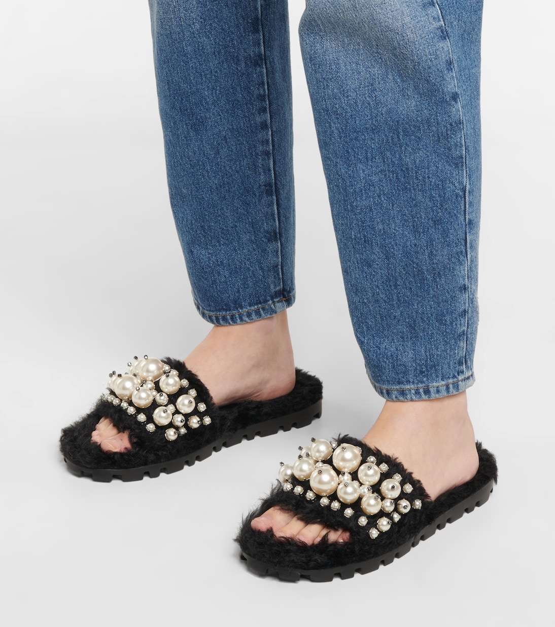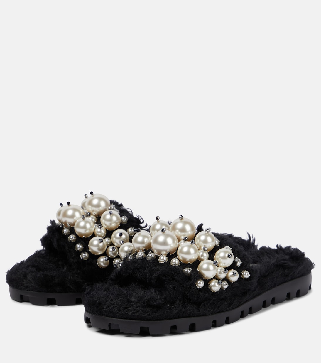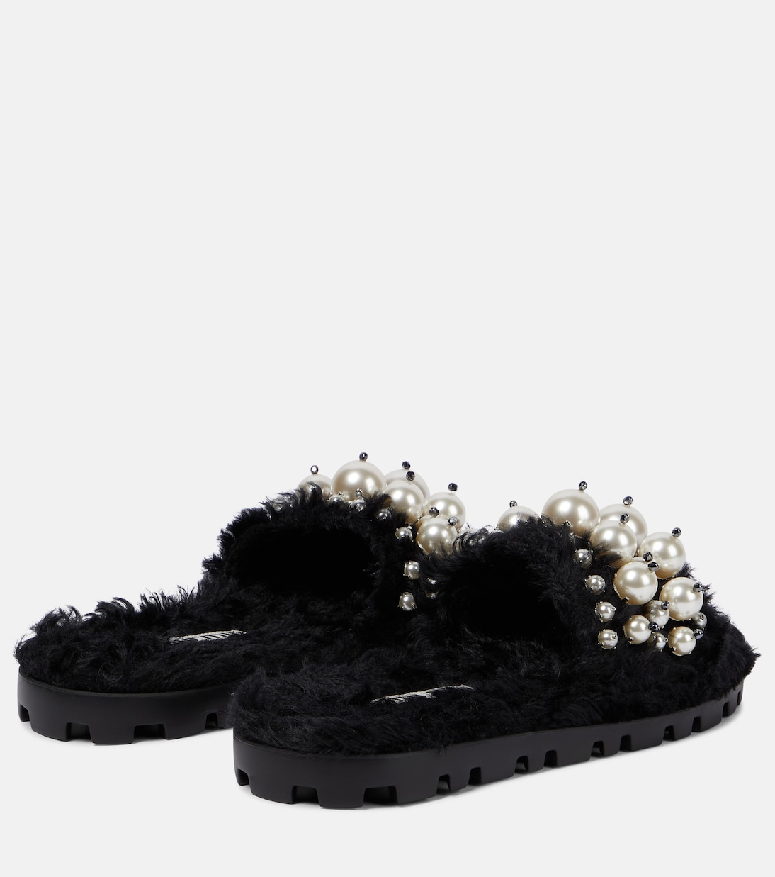 Добавьте гламура в свой повседневный образ с этими шлепанцами из искусственной овчины от Miu Miu. Ремешки украшены искусственным жемчугом для игривого эффекта.