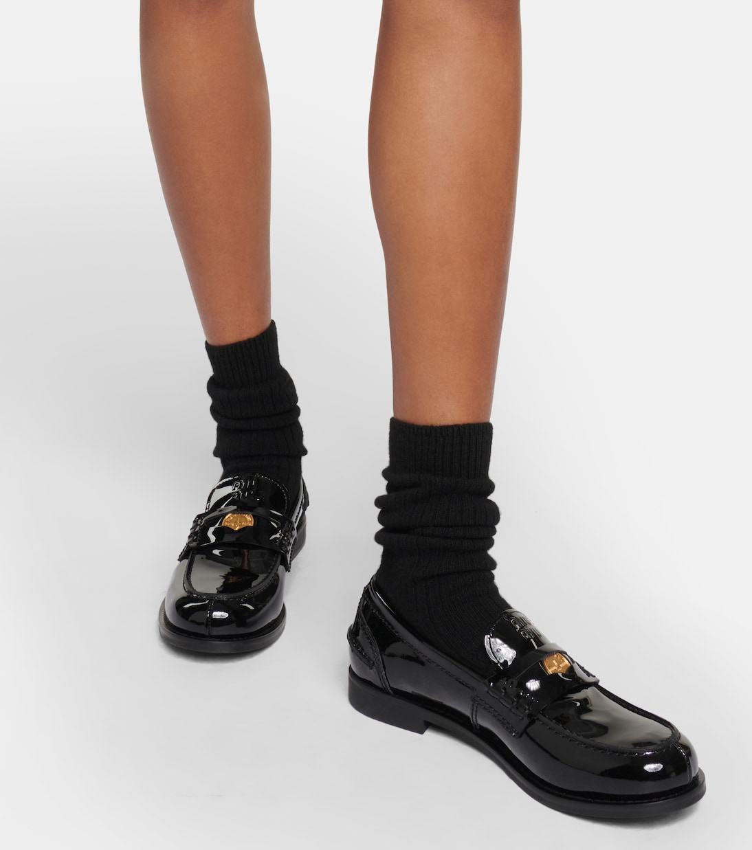 Раскованность, беззаботность и нарочито бунтарский дух — вот отличительные черты Miu Miu от Миуччи Прады. Эти лоферы, изготовленные в Италии из блестящей лакированной кожи, дополнены золотистым брендингом и тисненым логотипом на язычках.
