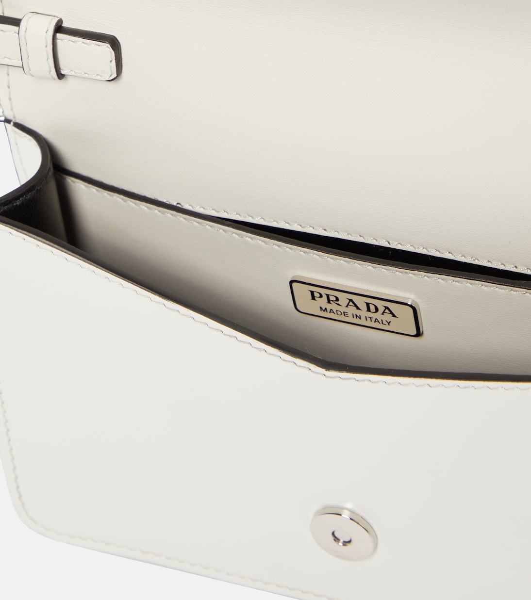 Эту миниатюрную сумку через плечо от Prada можно полюбить за многое. Она выполнена из белой шлифованной кожи и украшена увеличенным изображением знаменитого треугольного логотипа бренда.