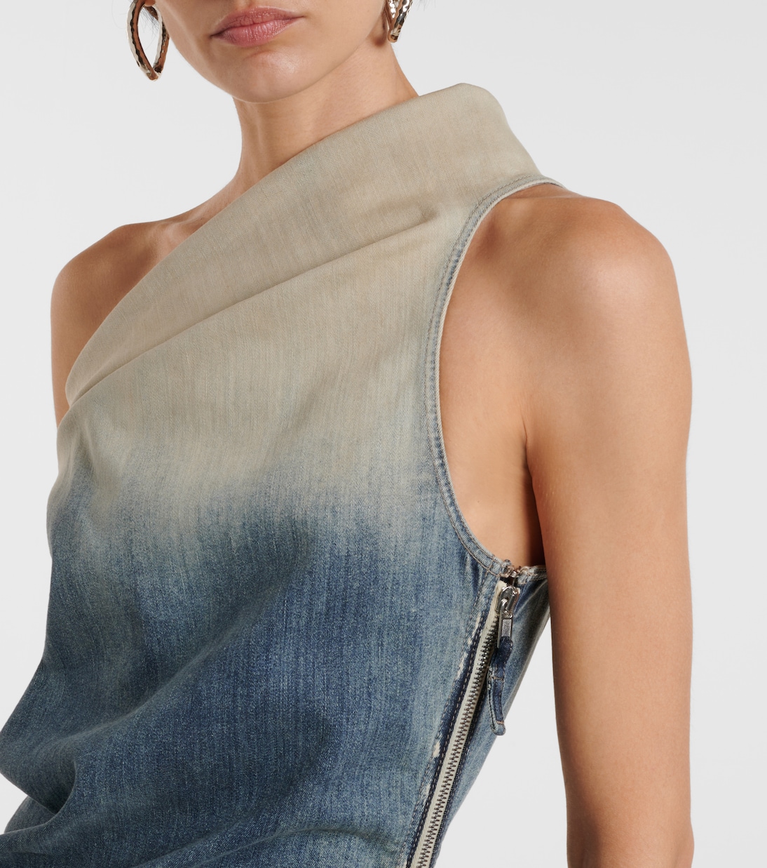 Рик Оуэнс, метко прозванный «Властелином тьмы», привносит готические и индустриальные мотивы в авангардный дизайн. Платье миди Athena выполнено из денима с винтажной отделкой и имеет вырез на одно плечо.