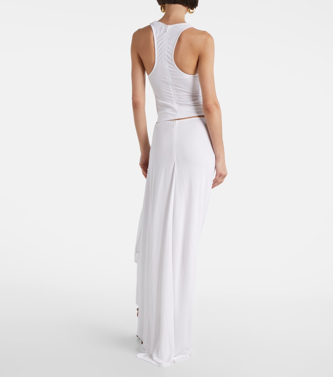 Юбка Crescent от Christopher Esber отличается асимметричным драпированным кроем с одной открытой штаниной. Модель застёгивается на потайную молнию.