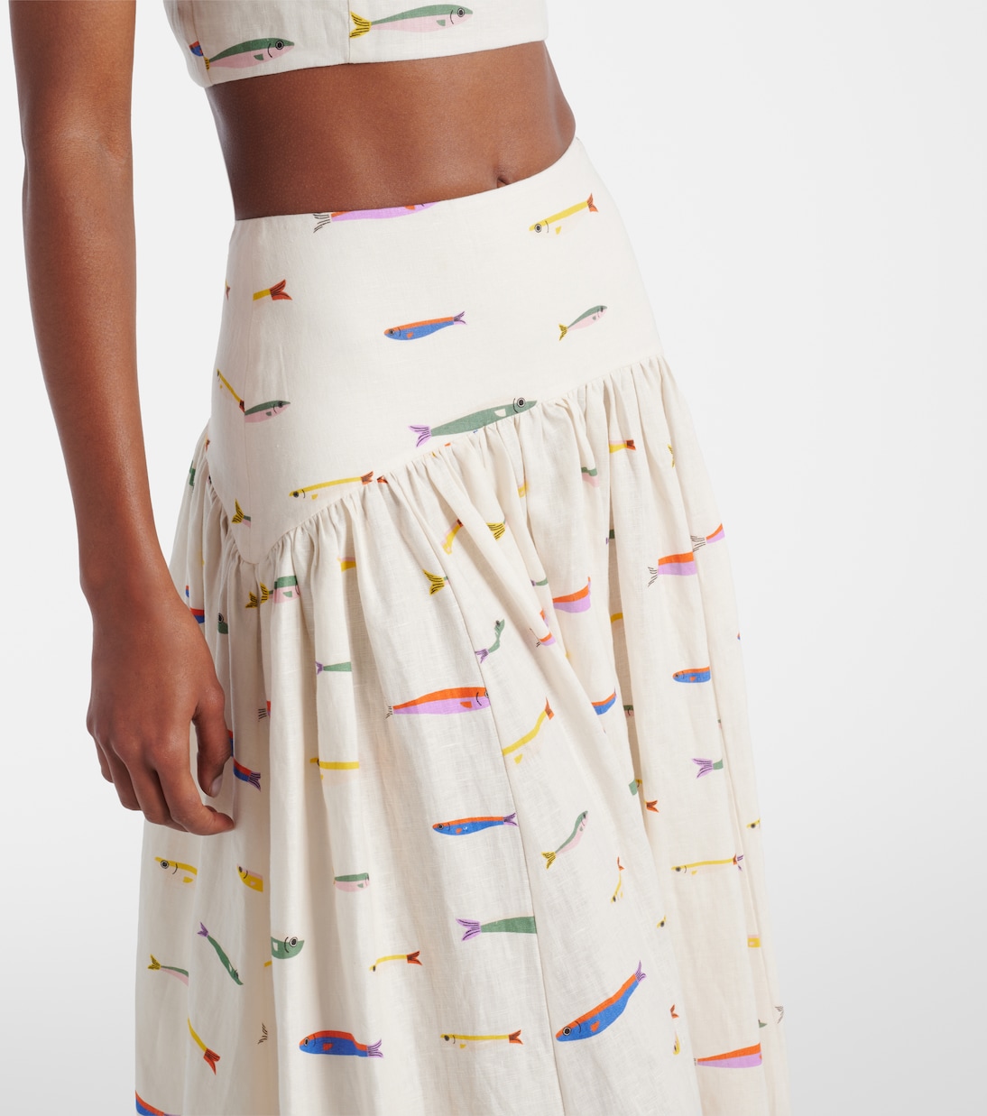 Юбка макси Procida от Staud выполнена из чистого льна с ярким принтом в виде сардин. Модель имеет изогнутую кокетку на бедрах, переходящую в А-силуэт.