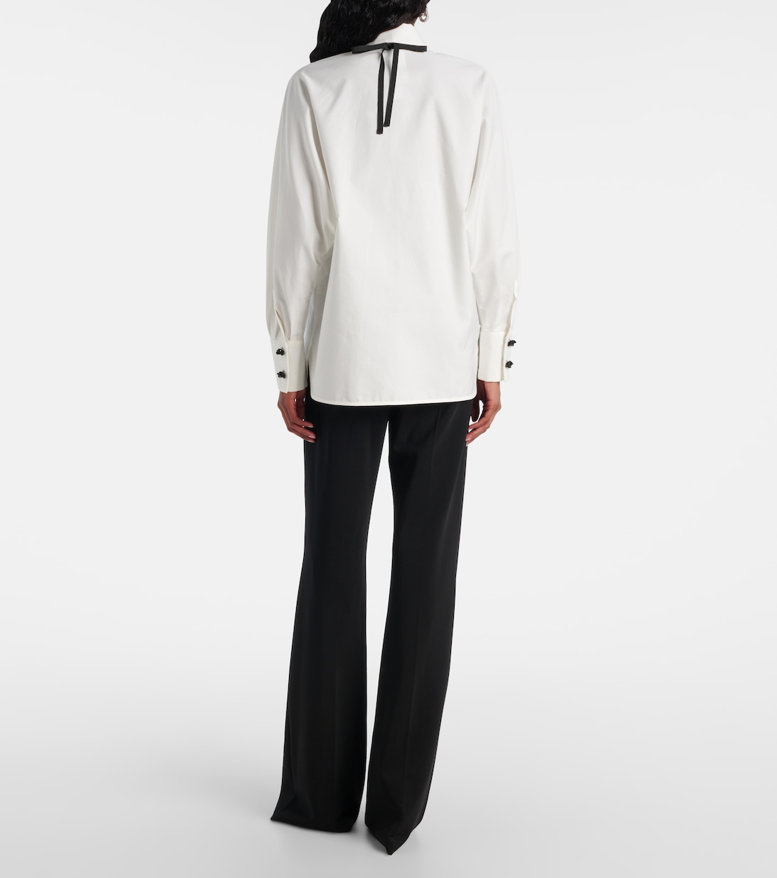Рубашка Roll от Max Mara – квинтэссенция итальянской изысканности и элегантности. Эта модель из хлопкового поплина с шёлком дополнена съёмным галстуком-бабочкой, расшитым бисером, и пуговицами с драгоценными камнями на рукавах, создающими изысканный цветовой контраст.