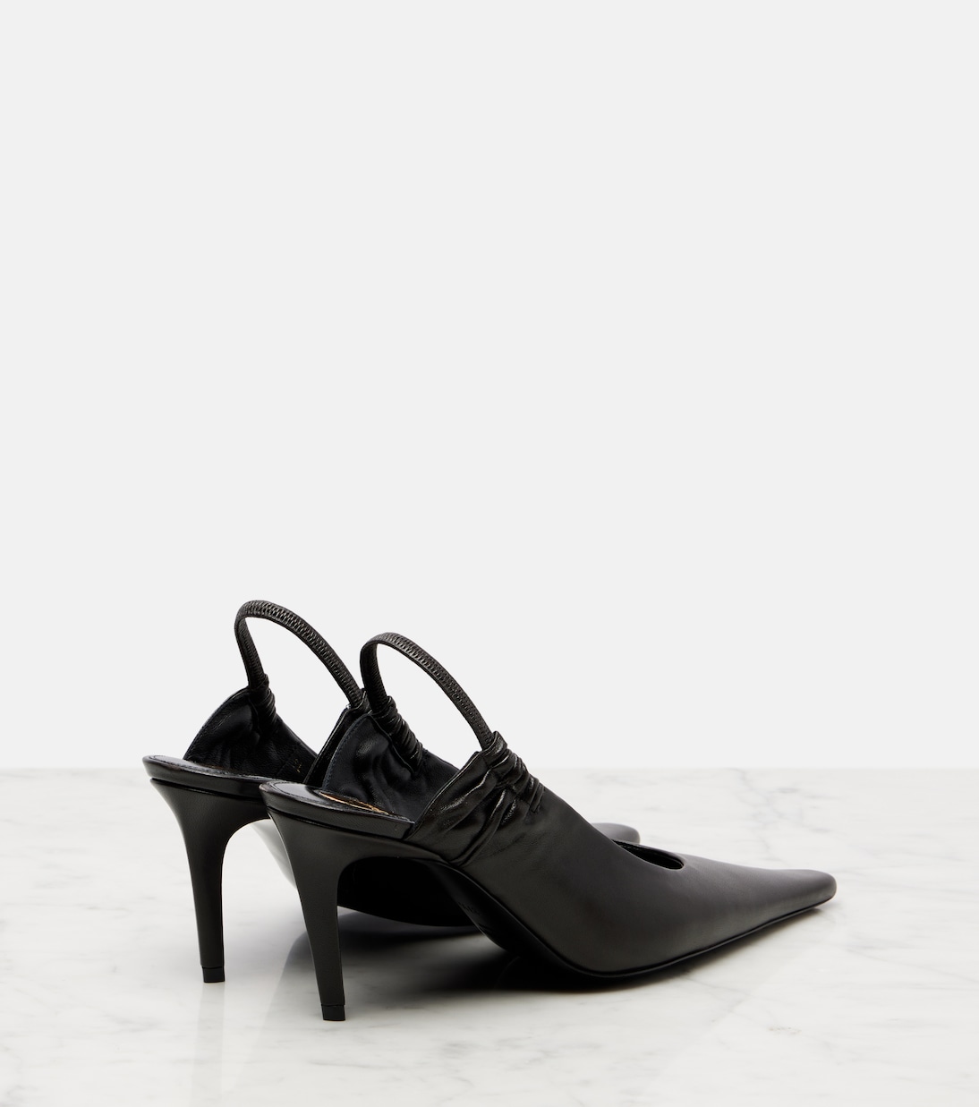С 1961 года Saint Laurent олицетворяет парижскую элегантность. Туфли-лодочки Anne-Marie с открытой пяткой, изготовленные в Италии из кожи, имеют изящный каблук высотой 75 мм, острый носок и ремешок с открытой пяткой.