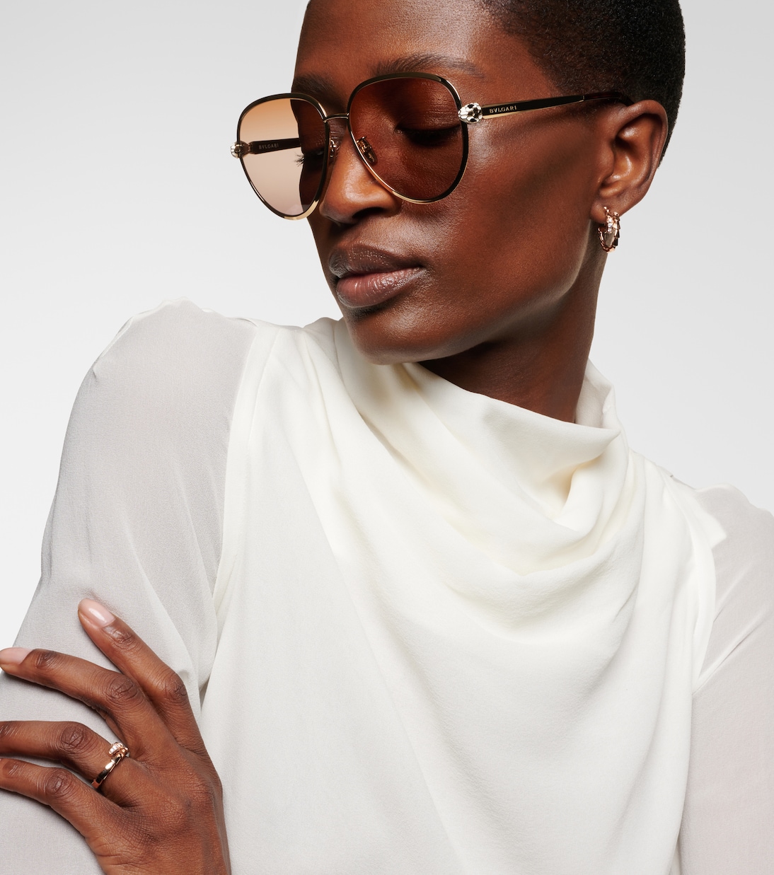 Достигните новых высот сдержанной элегантности с солнцезащитными очками Serpenti Forever от Bvlgari. Классическая оправа-авиатор выделяется золотистой отделкой на ободках и заушниках.