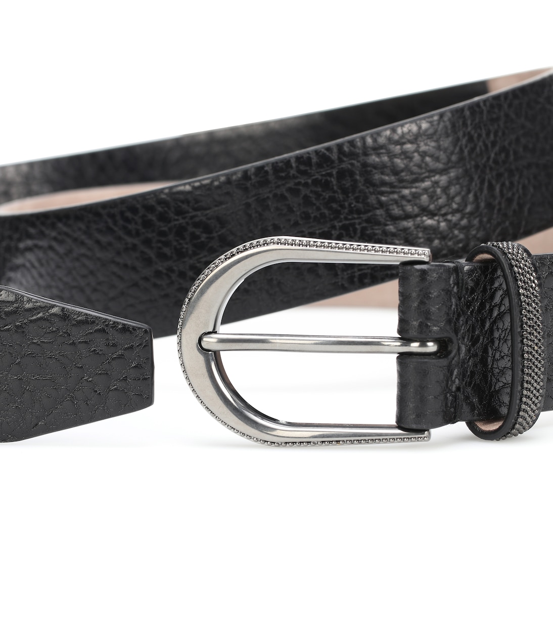 Если вам по душе аксессуары с изящными изгибами, обратите внимание на этот тонкий кожаный ремень от Brunello Cucinelli. Ремень изготовлен в Италии из зернистой чёрной кожи с пряжкой из состаренного металла и дополнен изящной цепочкой Мониль на шлёвке.
