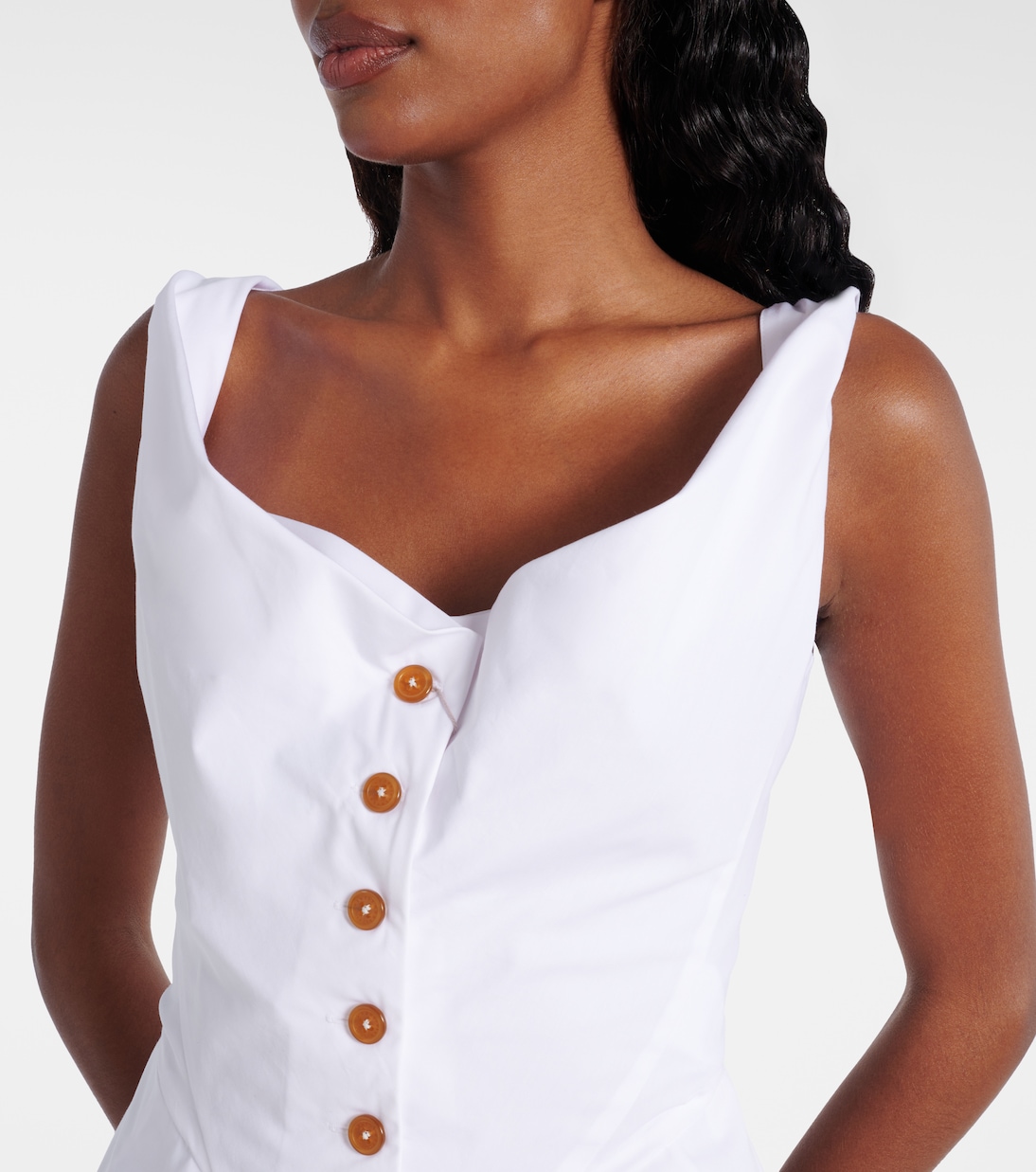 Жилет Monday от Vivienne Westwood отличается эффектным силуэтом с облегающим лифом, расклешенным к талии. Изготовлен из плотного хлопка и украшен скульптурными складками вокруг горловины.