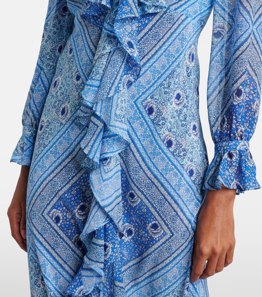 Забудьте о бесконечных поисках скрытых сокровищ: платья Rixo в винтажном стиле превосходят любые находки на блошином рынке. Длинное платье Gracze выполнено из шёлка с оборками на манжетах, застёжкой на пуговицы спереди и молнией сбоку.