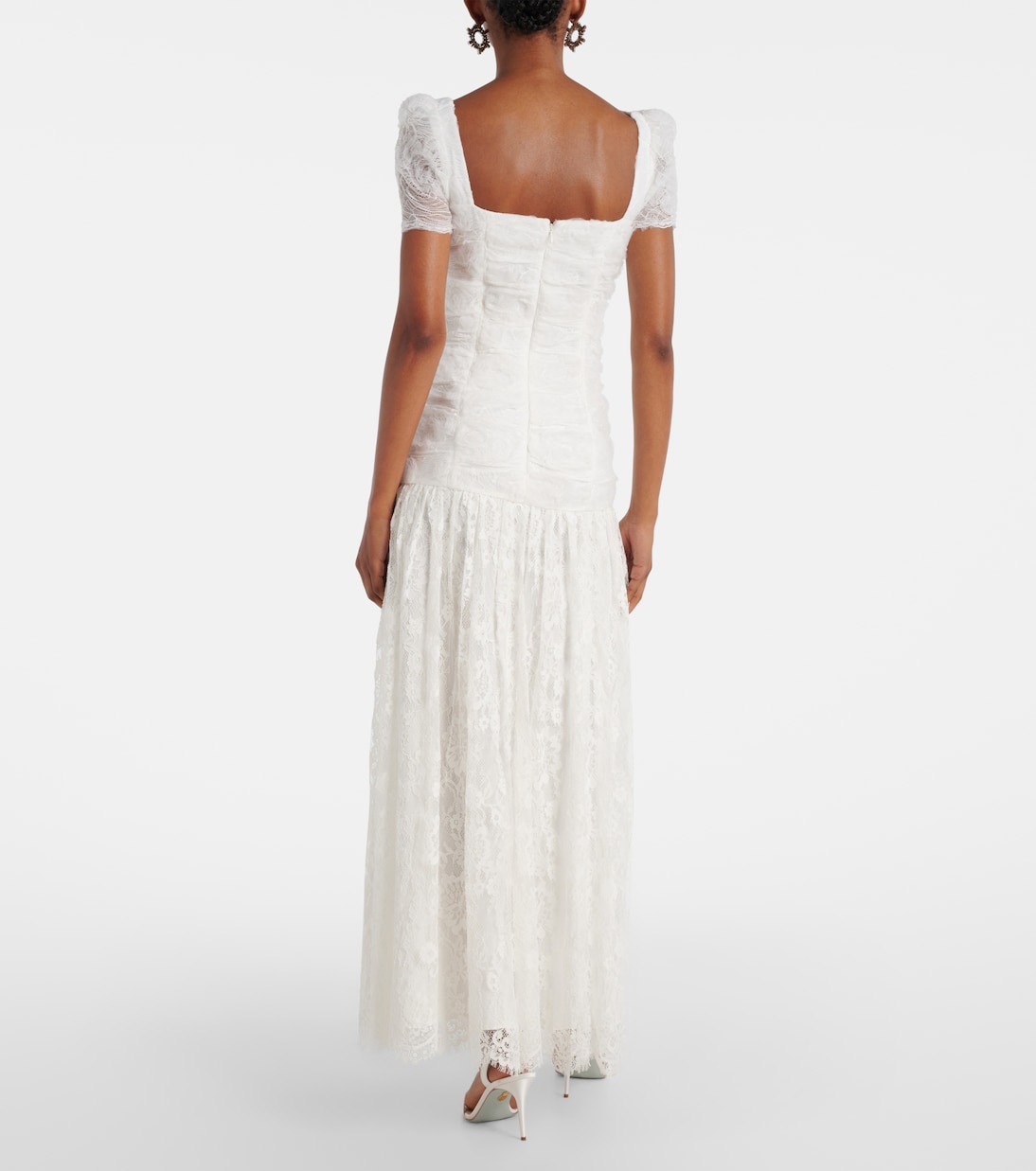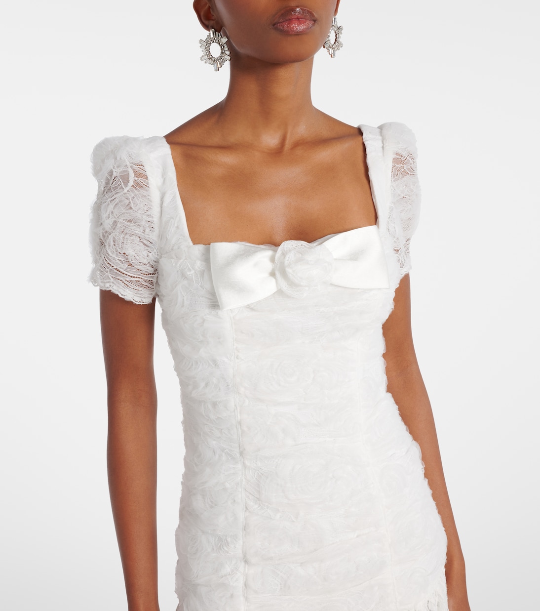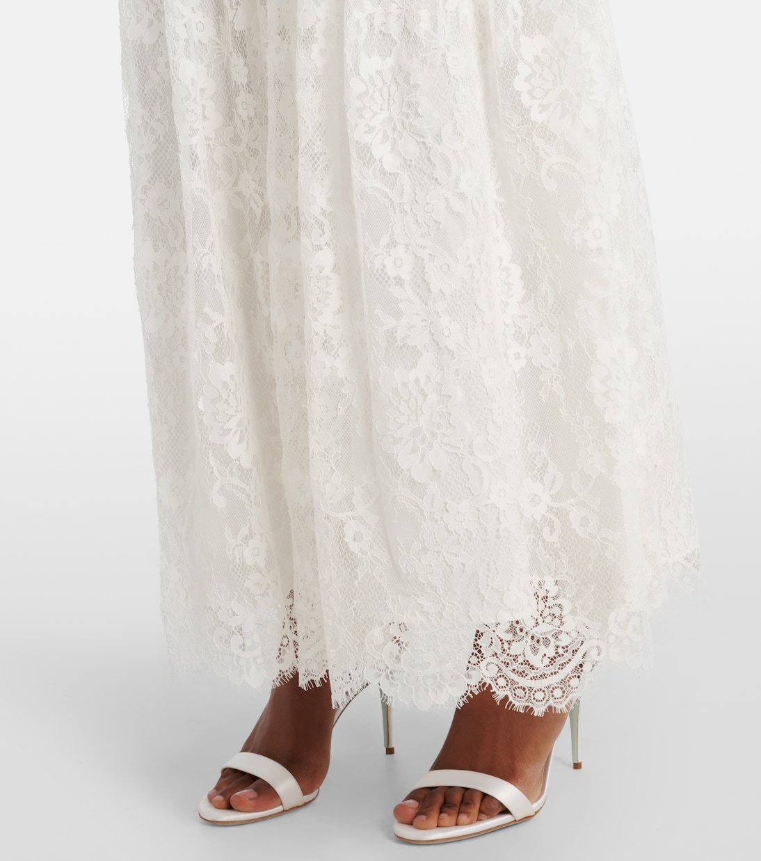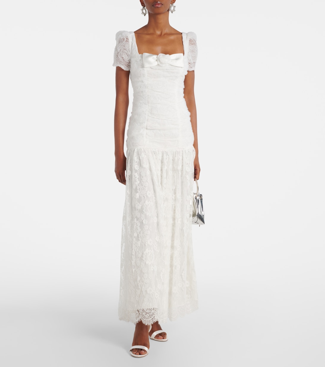 Своей миссией воспевать женщин в каждом образе, Self-Portrait завоевала любовь поклонников благодаря своей мягкой и изящной эстетике. Это платье состоит из лифа из тюля с рюшами и пышной кружевной юбки макси с бантом на груди.