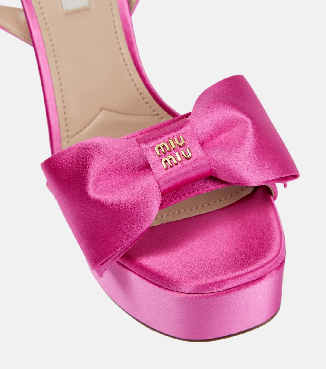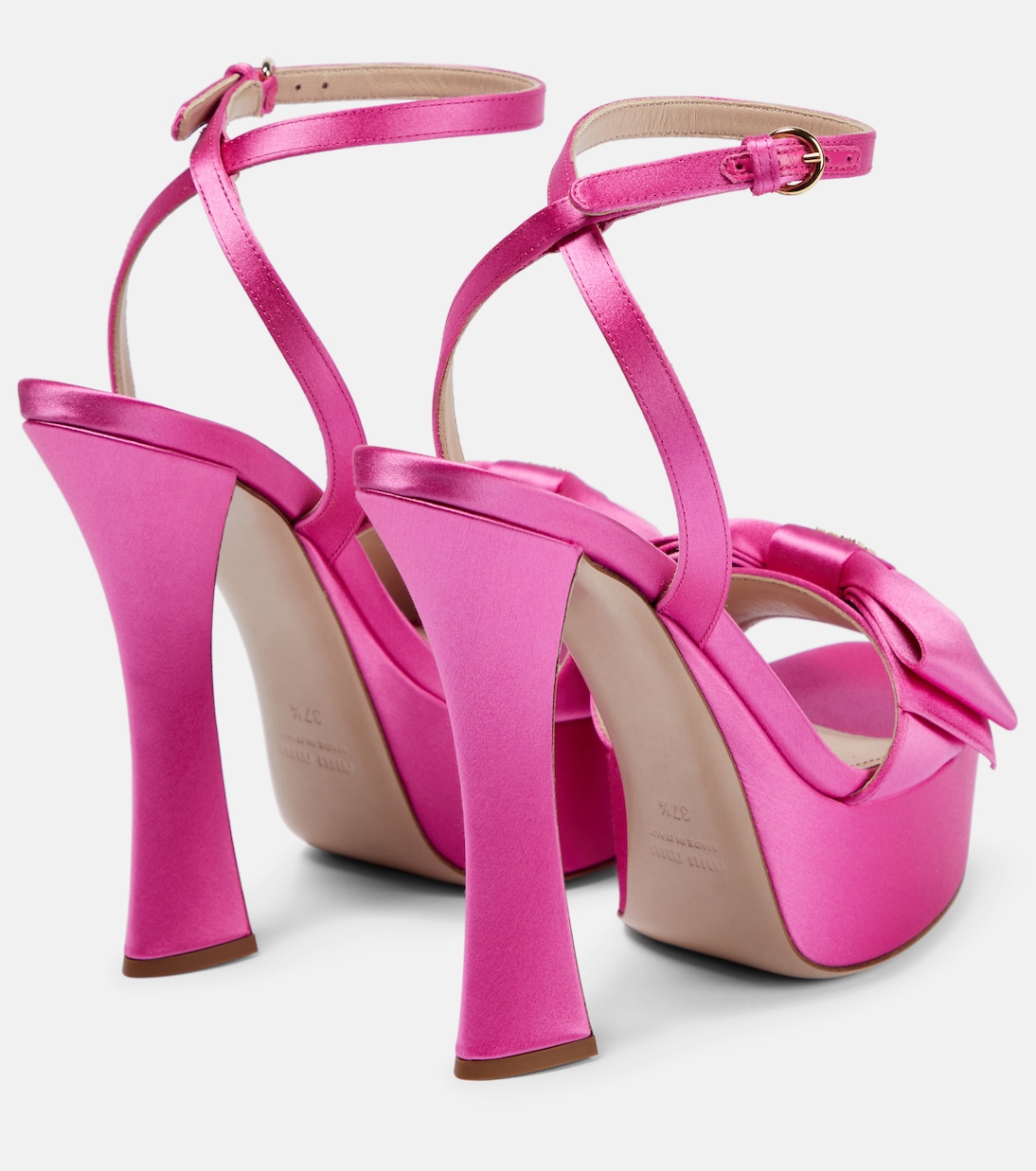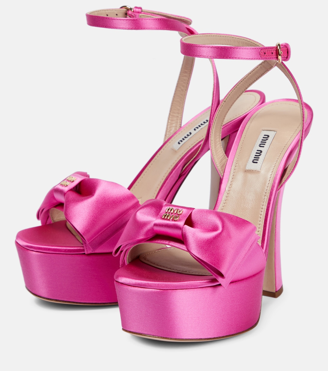 Сделайте каждый шаг гламурным в этих босоножках на платформе от Miu Miu. Сделаны в Италии из блестящего атласа. Тонкие ремешки на щиколотке и бантики на носке.