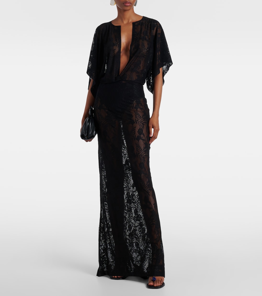 Затмите всех на вашем следующем мероприятии в платье Obie от Norma Kamali. Оно выполнено из прозрачного цветочного кружева, создающего чарующий эффект, и дополнено широкими короткими рукавами и разрезом на горловине.