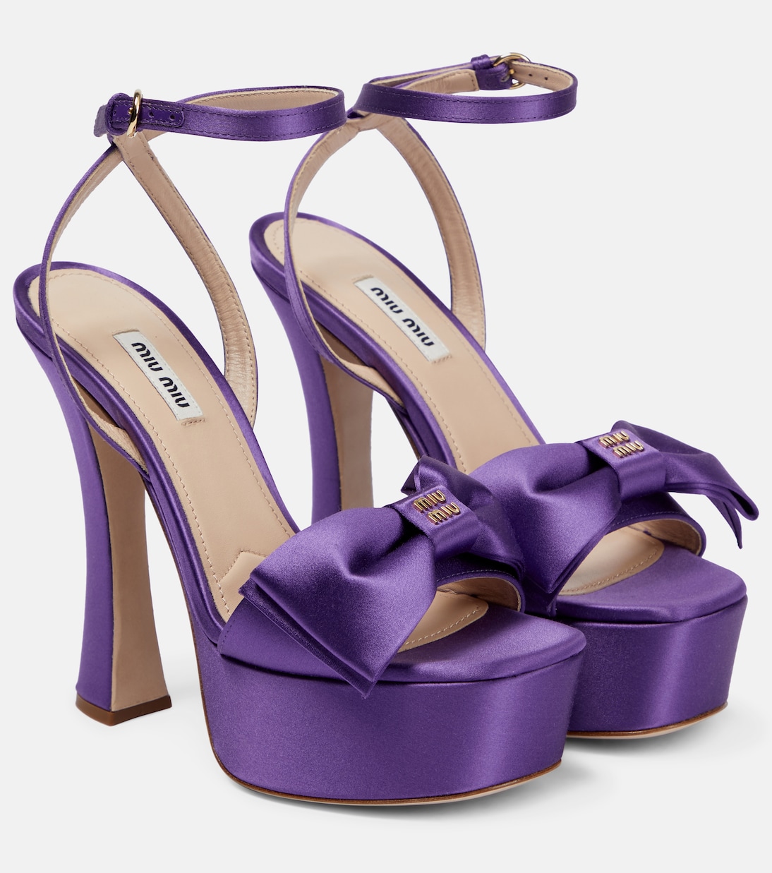 Игривая энергия Miu Miu подчеркивается этими босоножками на платформе. Модель выполнена из блестящего атласа в яркой цветовой гамме. Она украшена крупным бантом, логотипом в ретро-стиле и имеет изогнутый каблук.