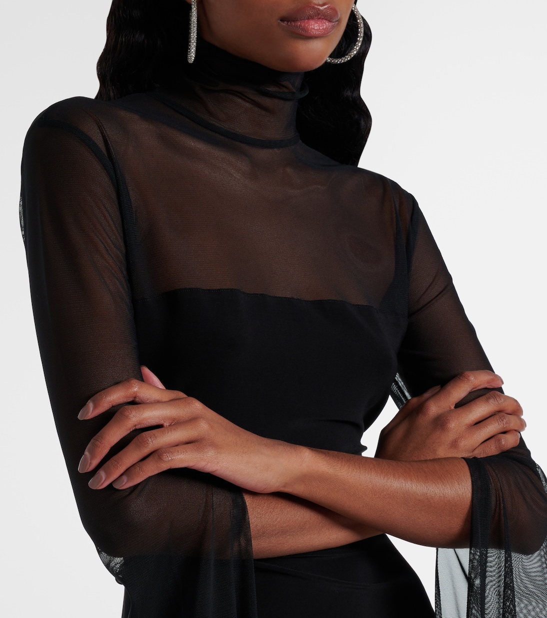 Игровой подход к дизайну от удостоенного наград дизайнера Нормы Камали покоряет мир с 1960-х годов. Взять, к примеру, это мини-платье: оно сшито из джерси и прозрачной сетки, имеет удлиненные рукава и водолазку.