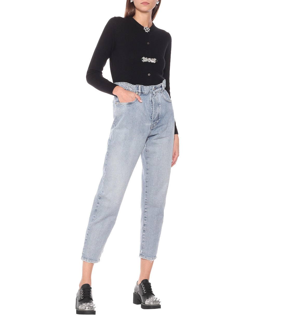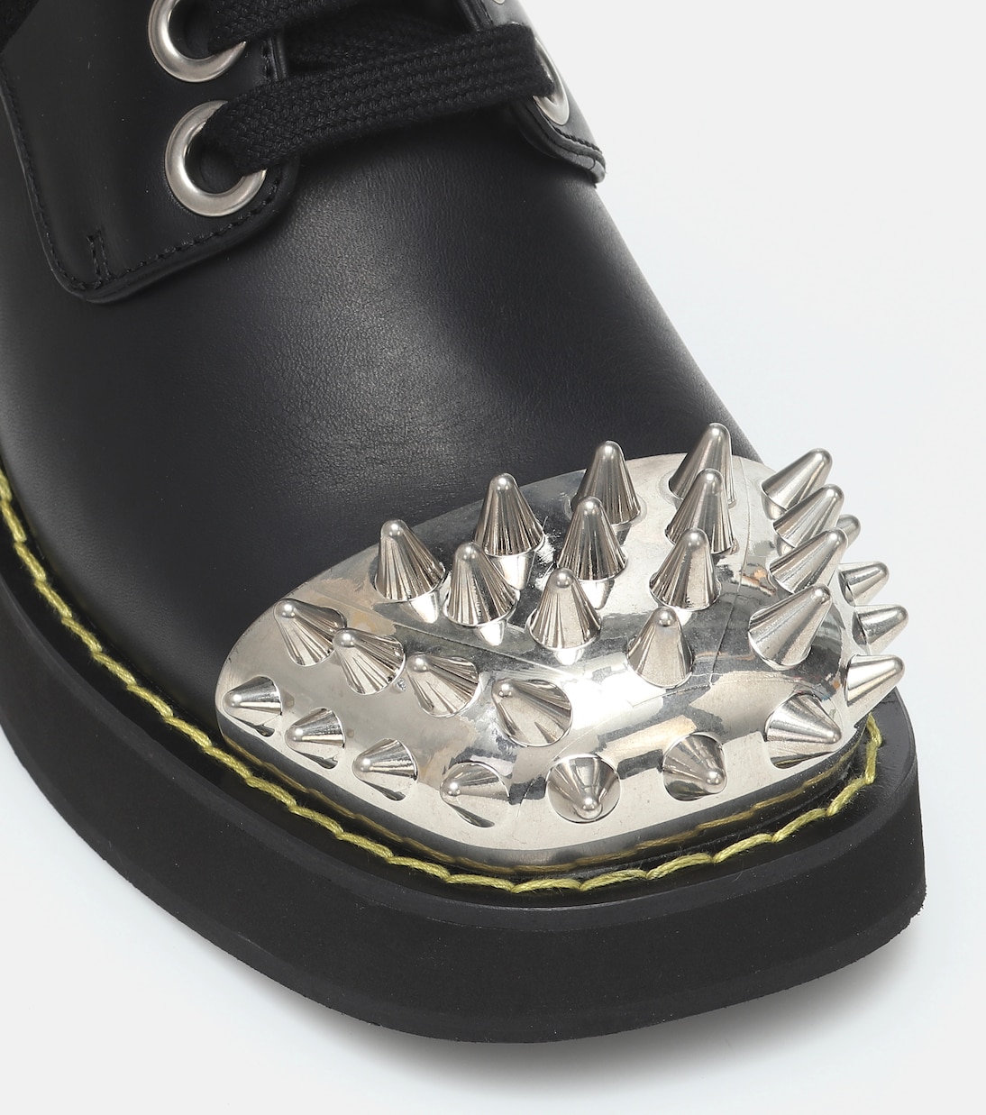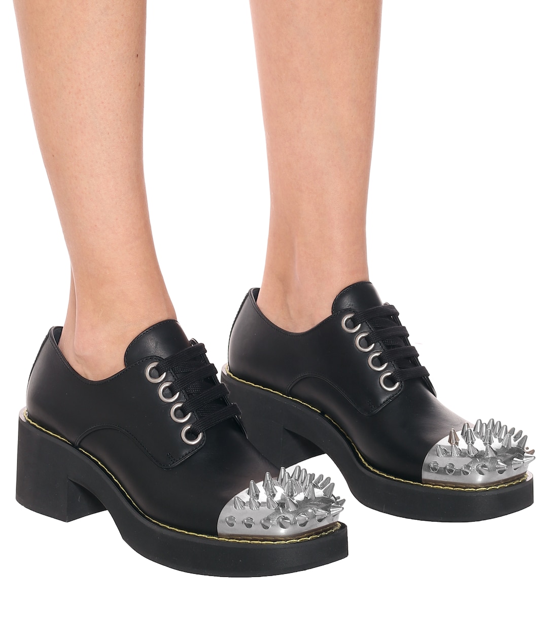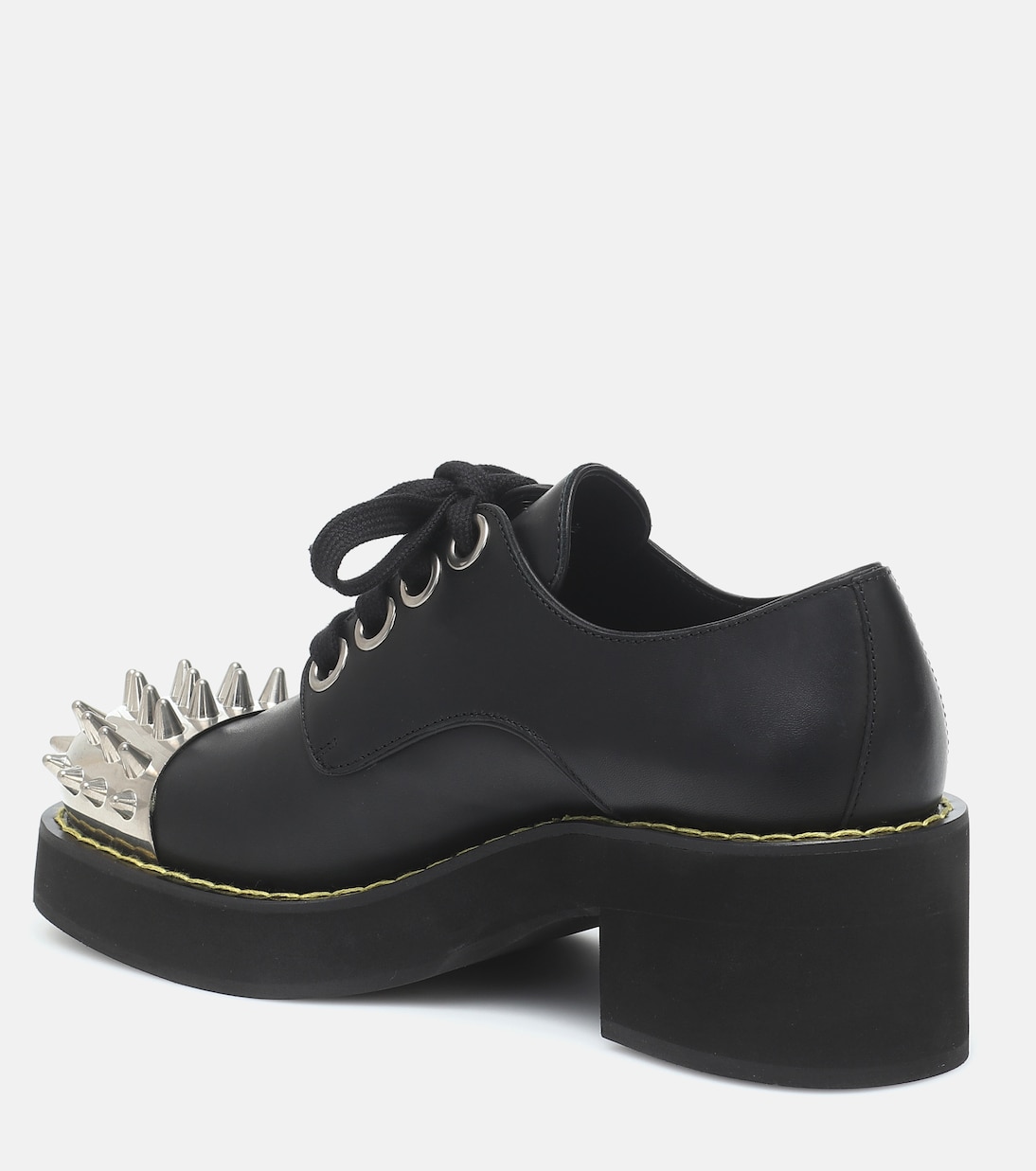 Склонность Miu Miu переосмысливать традиционные коды с бунтарскими нотками ярко проявляется в этих чёрных дерби. Сделанные в Италии из гладкой телячьей кожи, они имеют квадратный носок, украшенный серебристыми шипами, и резиновую подошву с массивным блочным каблуком.