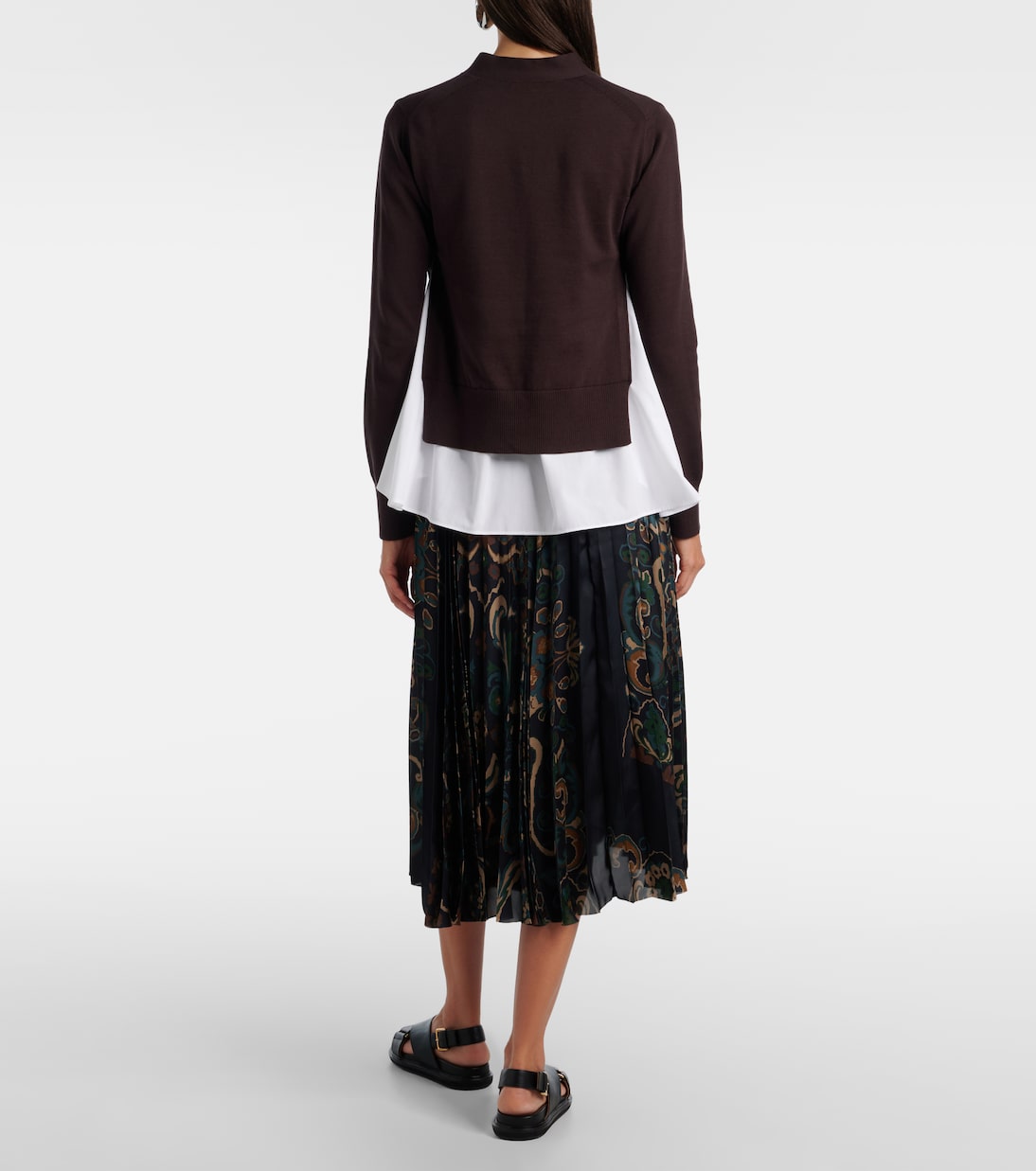 Склонность Sacai к гибридным дизайнам позволяет сочетать контрастные фактуры, ткани и техники, создавая совершенно уникальные и инновационные образы. Эта универсальная вещь состоит из белой поплиновой рубашки и классического кардигана с высокими боковыми разрезами.