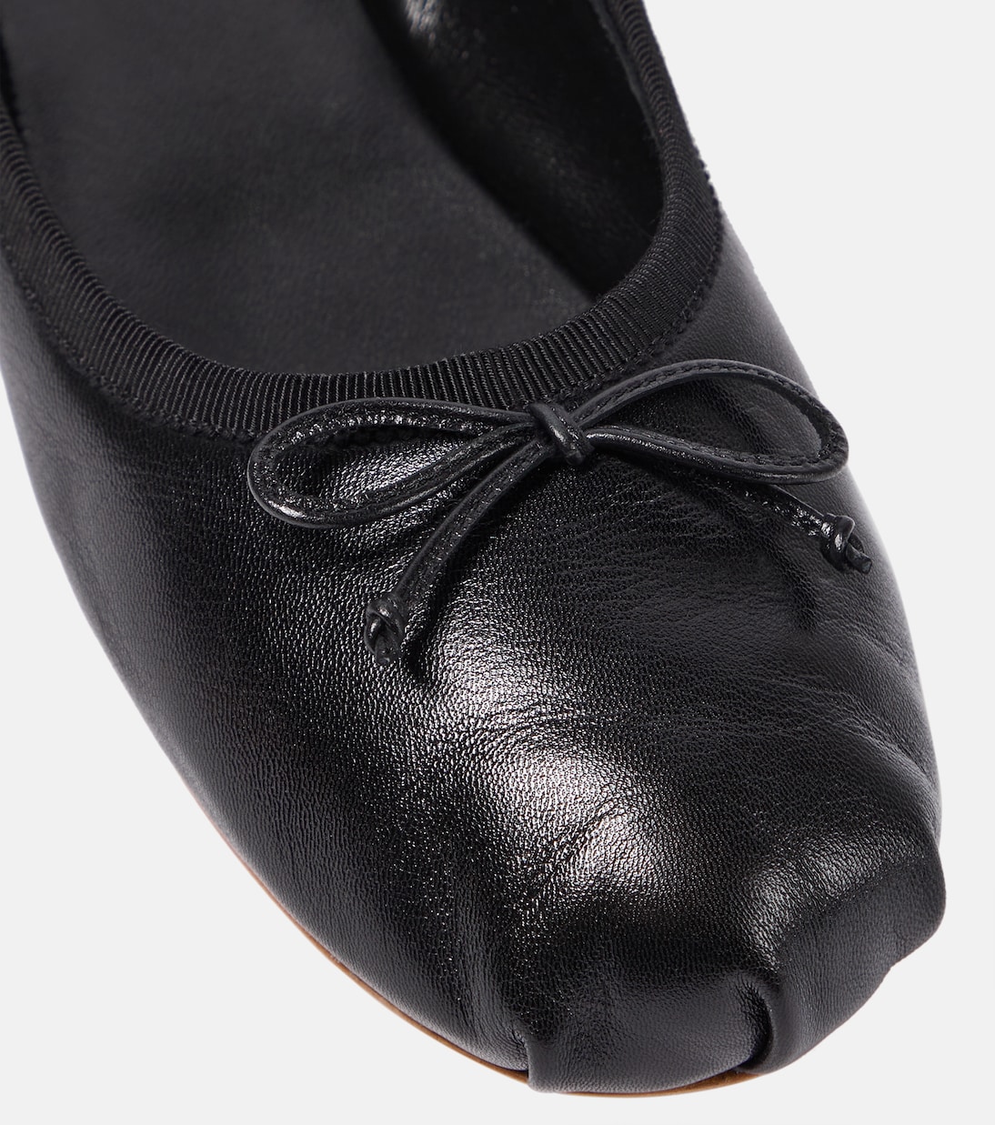 Идеально отполированные и практичные балетки от Miu Miu изготовлены из мягкой кожи наппа с прочной резиновой подошвой. Они украшены романтичными бантиками и эластичными жаккардовыми ремешками с логотипом.