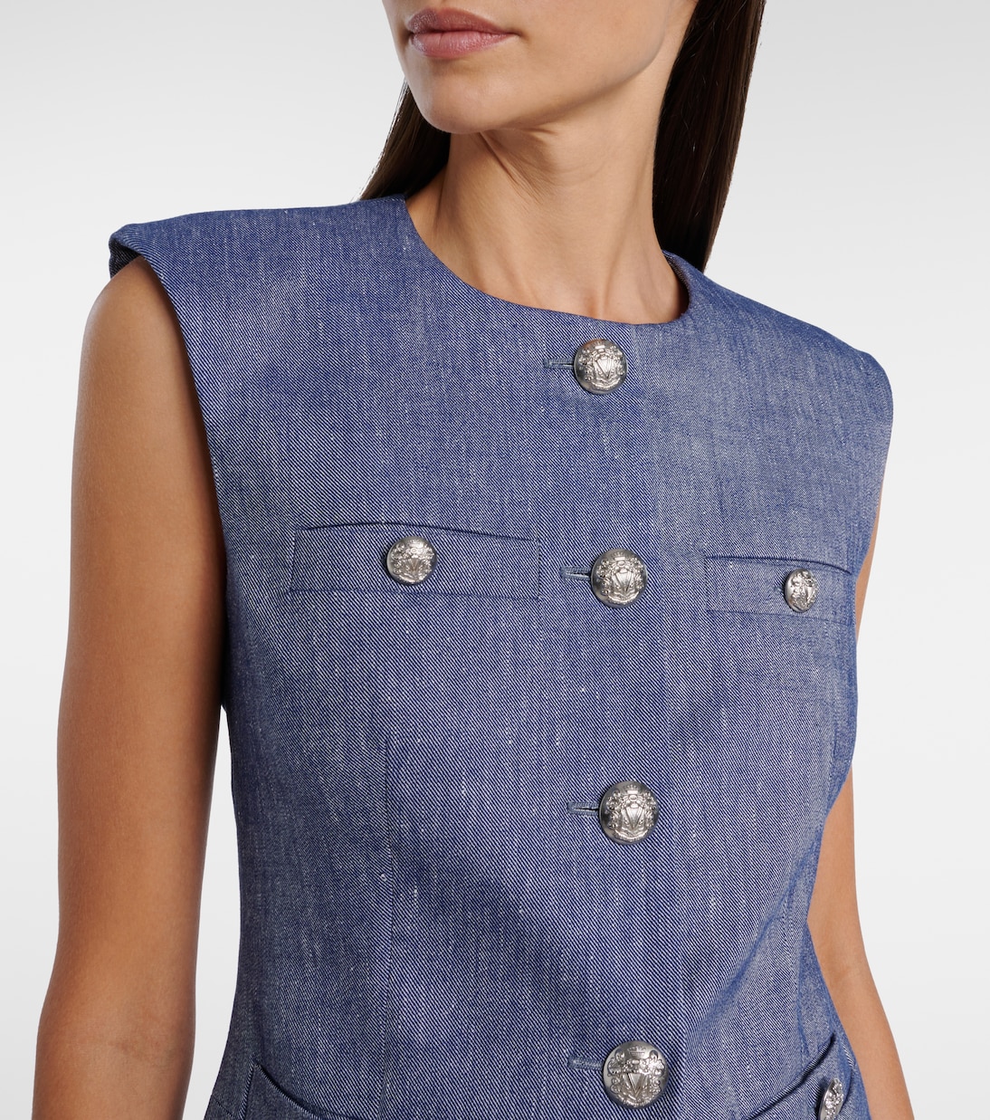 Идеально сшитый из льняной ткани жилет Tamara от Veronica Beard украшен крупными пуговицами с гербом. Четыре прорезных кармана позволяют носить эту модель как изысканный верхний слой, так и отдельно.