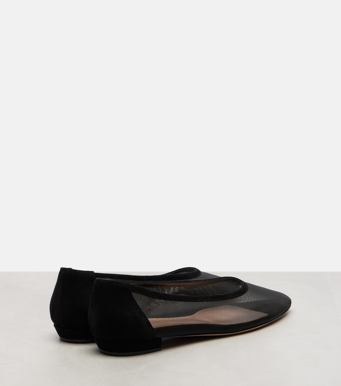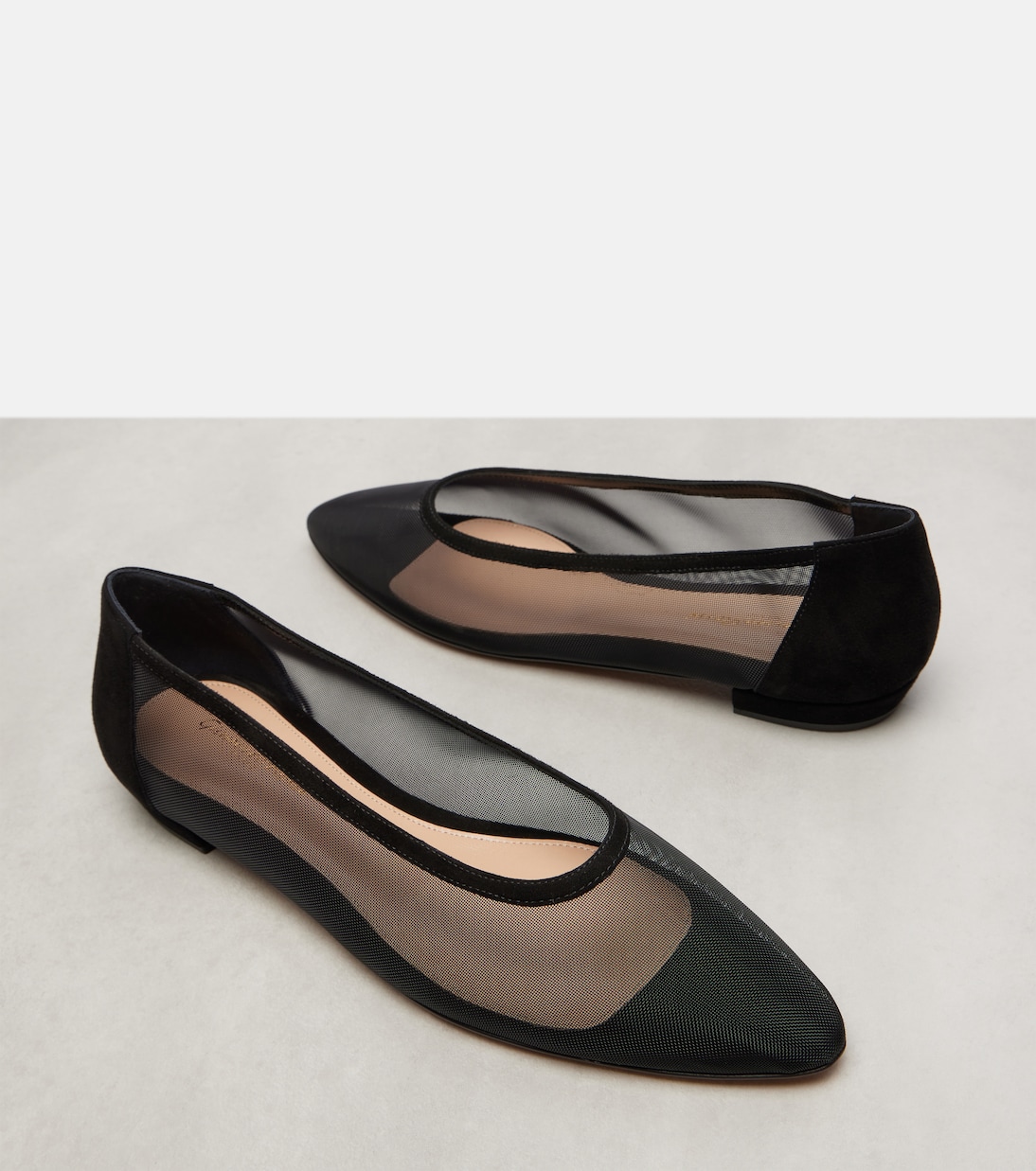 Изготовленные из материалов высочайшего качества, модели Gianvito Rossi изготавливаются вручную с использованием традиционных ремесленных технологий и инновационных материалов. Эти балетки из прозрачной чёрной органзы имеют заострённый носок.
