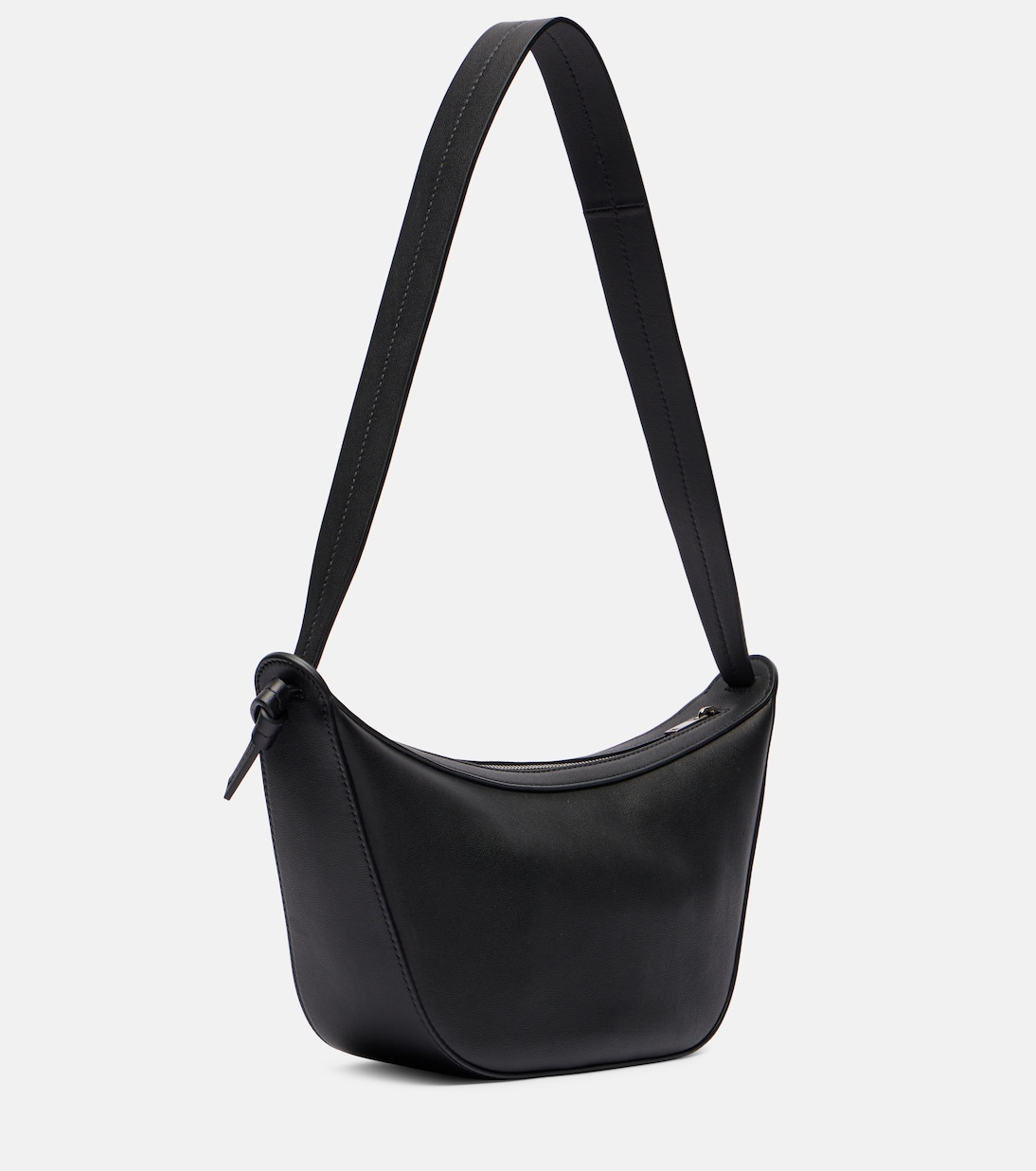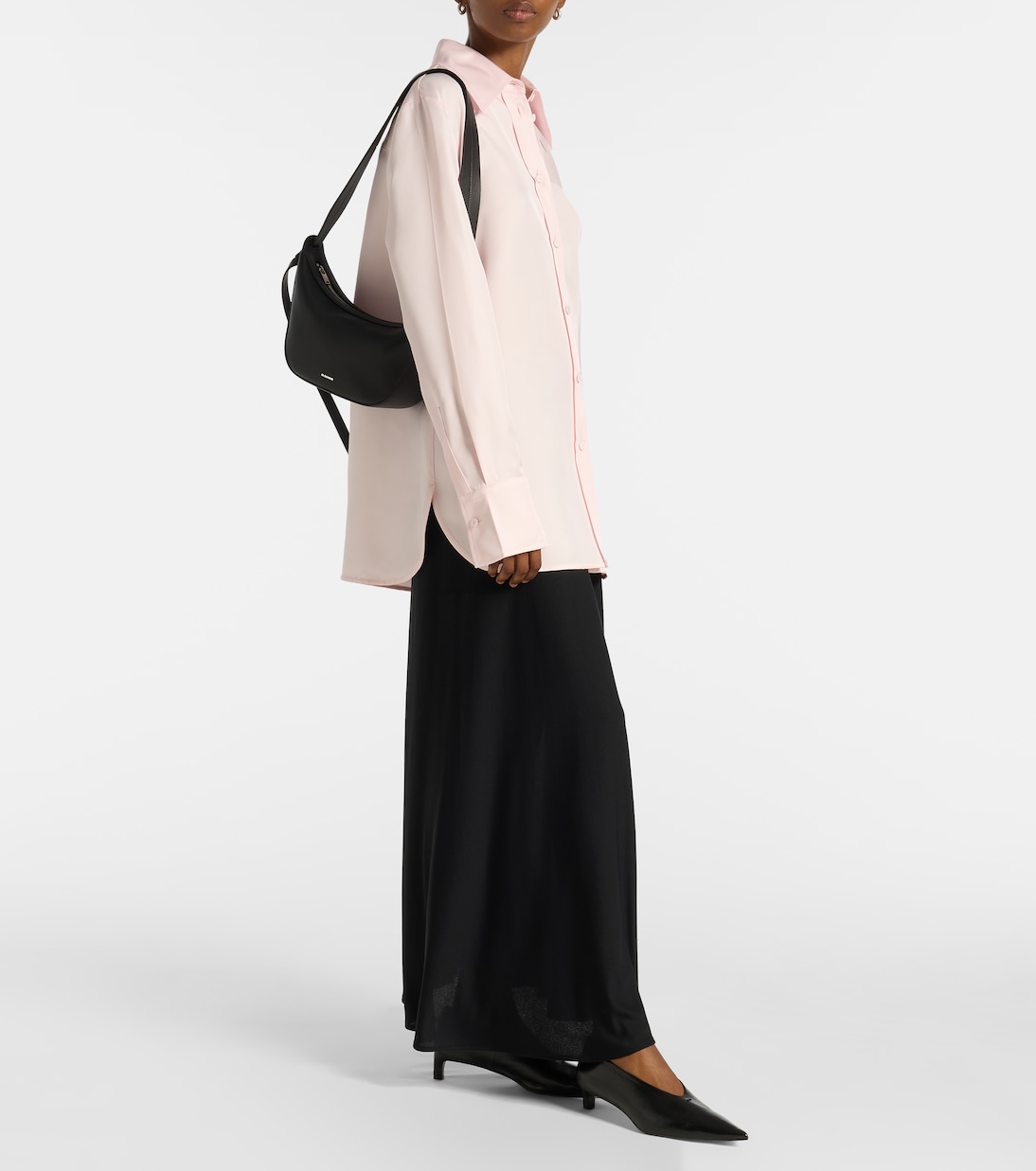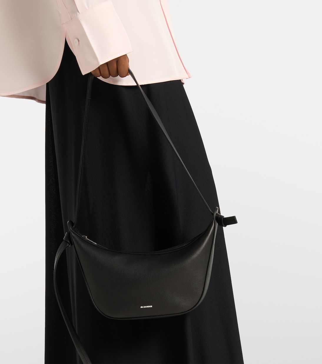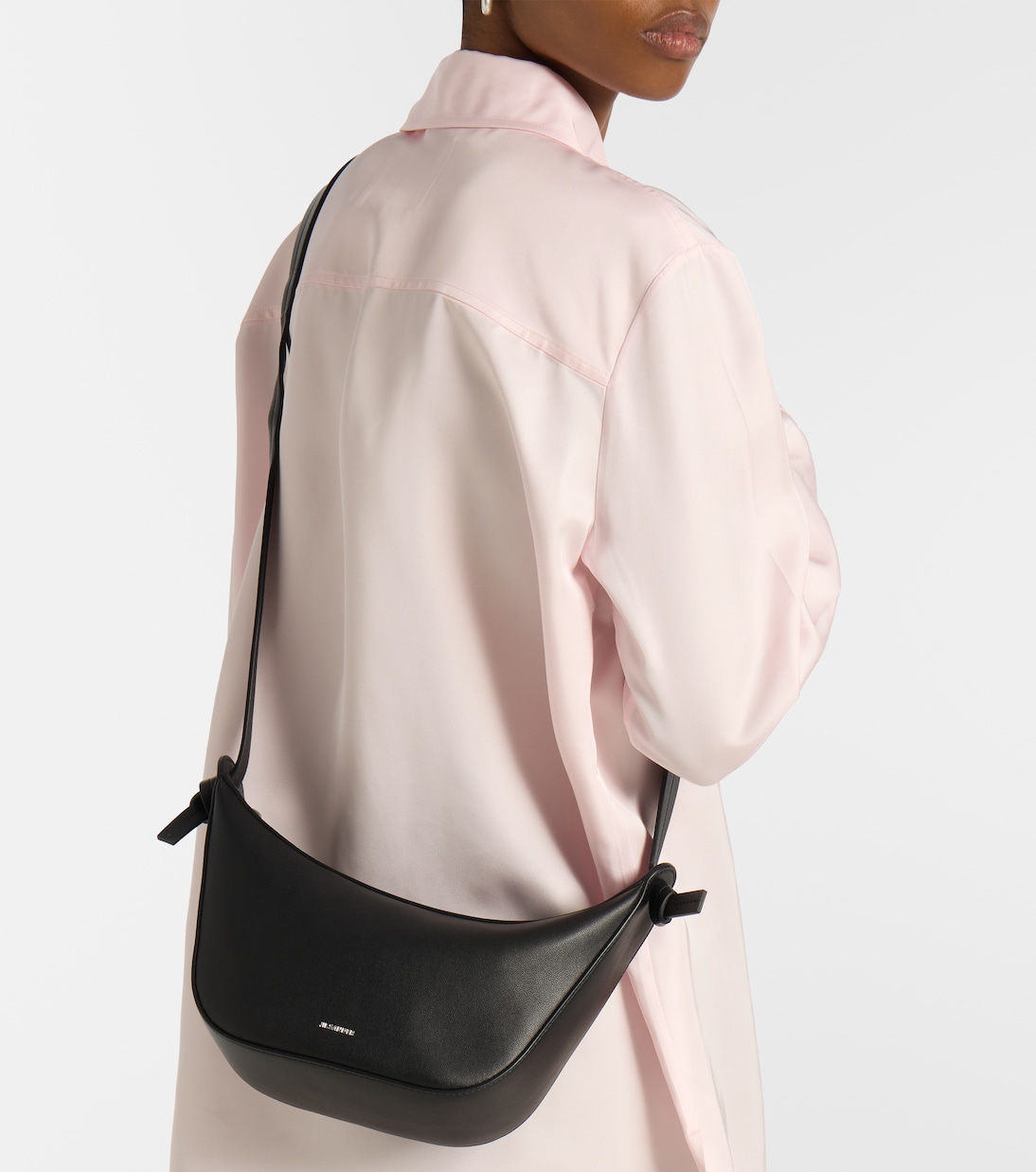 Изысканный минимализм Jil Sander характеризуется нейтральными тонами, чистыми линиями и точно расположенными деталями. Сумка Knot, изготовленная в Италии из черной кожи, представлена в компактном размере, с регулируемым ремешком, тисненым логотипом и внутренней отделкой из парусины.