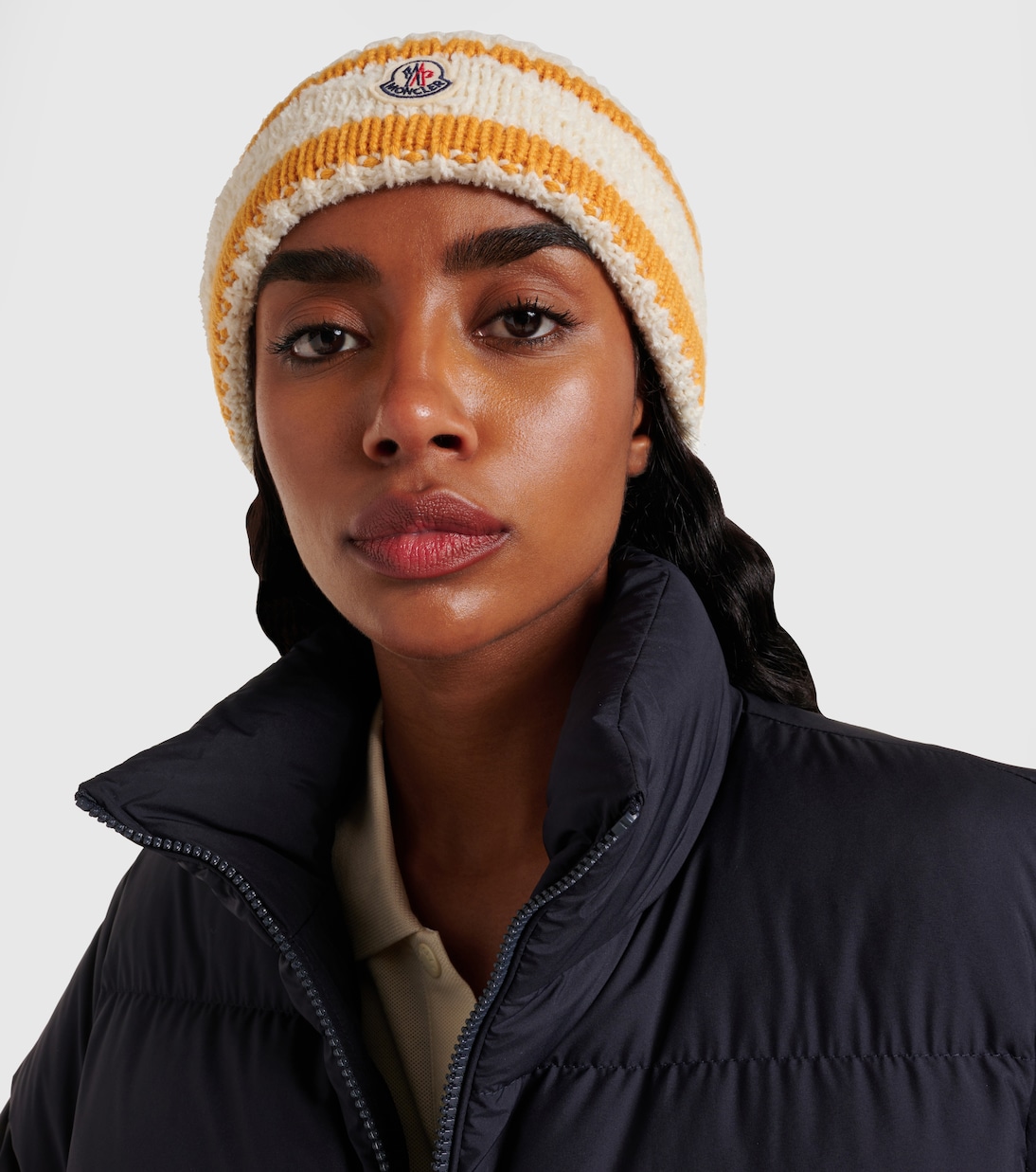 Сохраняйте стиль и тепло в этой шапке-бини от Moncler. Она выполнена из смесовой шерсти с полосатыми деталями и дополнена узнаваемым логотипом бренда.