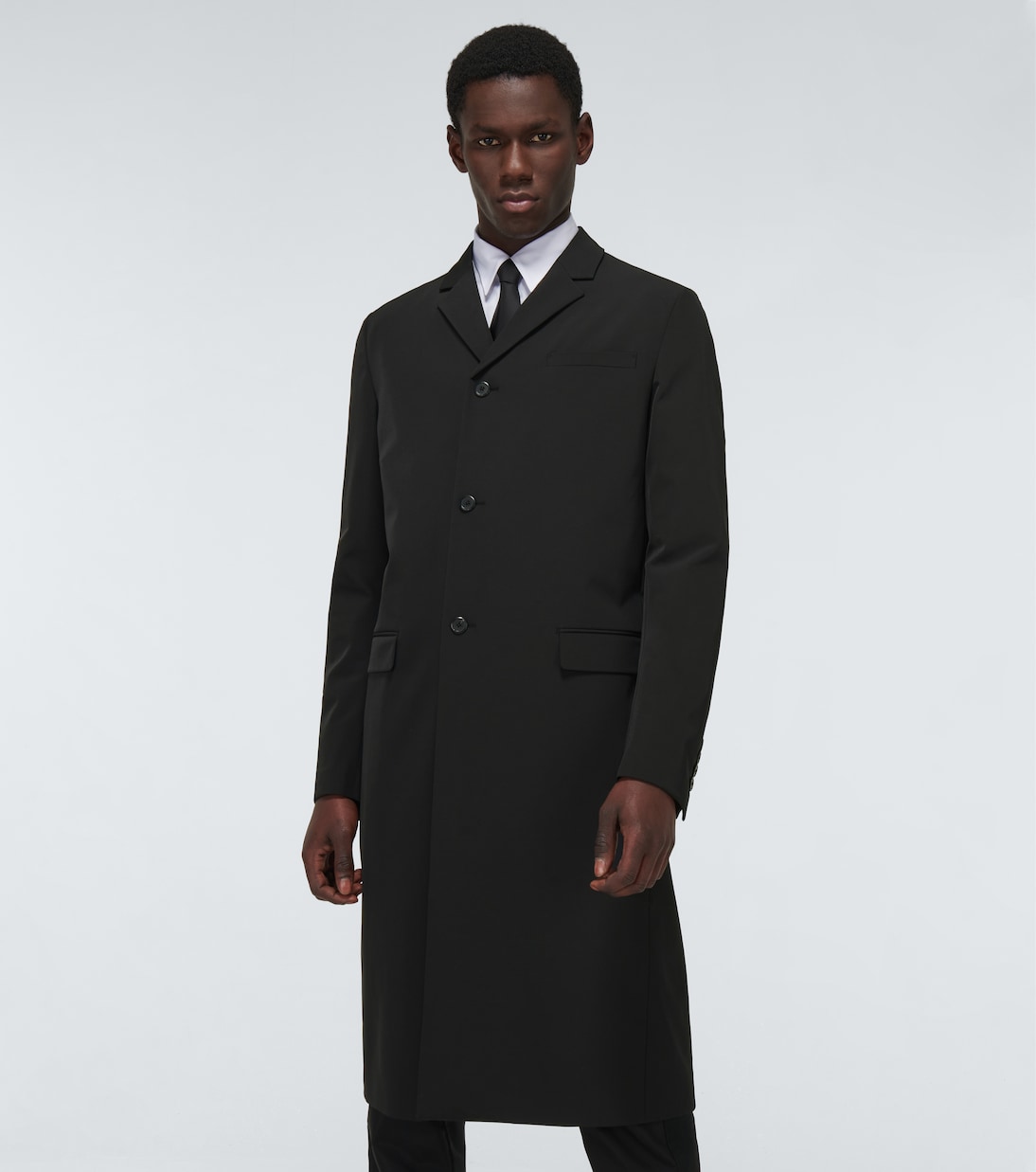 Сочетая спортивные мотивы с четким кроем, Prada обновляет классическое пальто в технологичном стиле, представляя однобортный перед и классические заостренные лацканы.