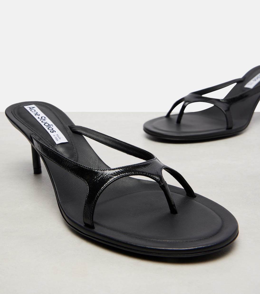 Стокгольмский бренд Acne Studios завоевал прочную популярность благодаря своей скандинавской эстетике. Сандалии Beverly из лакированной кожи дополнены каблуком высотой 60 мм.