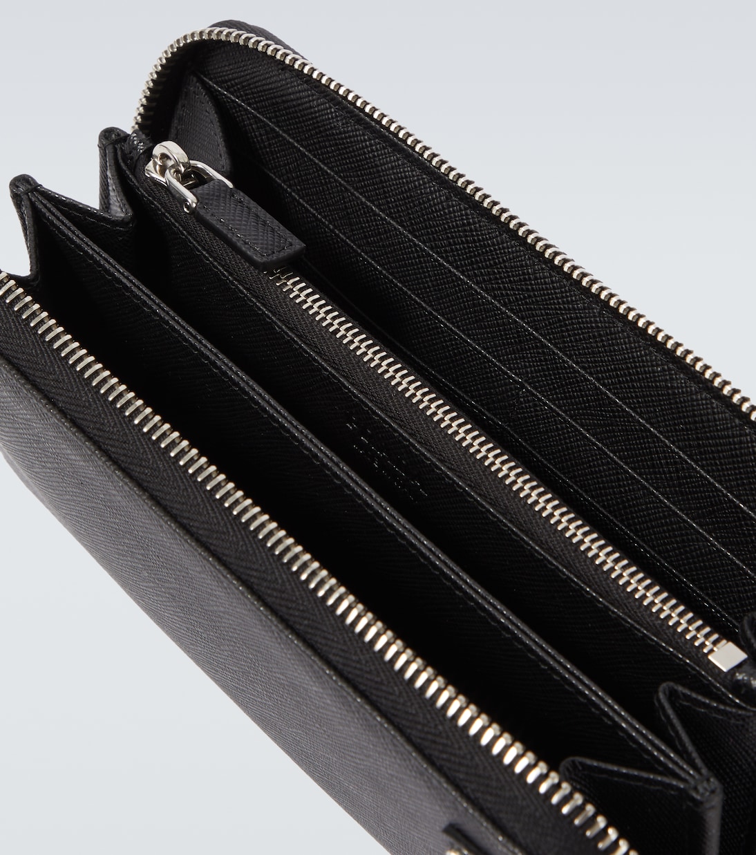 Использование Prada кожи Saffiano с перекрёстной штриховкой восходит к Марио Праде, который ценил её изысканность и долговечность. Этот кошелёк застёгивается на серебристую молнию и имеет 3 отделения, 12 слотов для карт и ещё один карман на молнии.