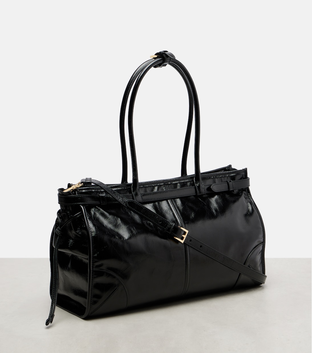 Сумка Prada Bonnie Large из глянцевой кожи отличается удлиненным силуэтом, пряжками и культовым треугольным логотипом. Prada переносит итальянское наследие в ярко выраженную современность, предлагая лаконичный и модный подход.