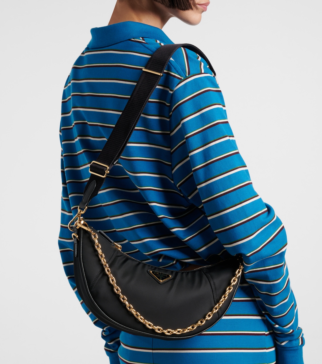 Сумка Prada Demi-Lune, изготовленная из экологичного ренейлона Re-Nylon, отличается изогнутым силуэтом, ремешком-цепочкой и застежкой-молнией. Prada переносит итальянское наследие в ярко выраженную современность, предлагая лаконичный и модный подход.