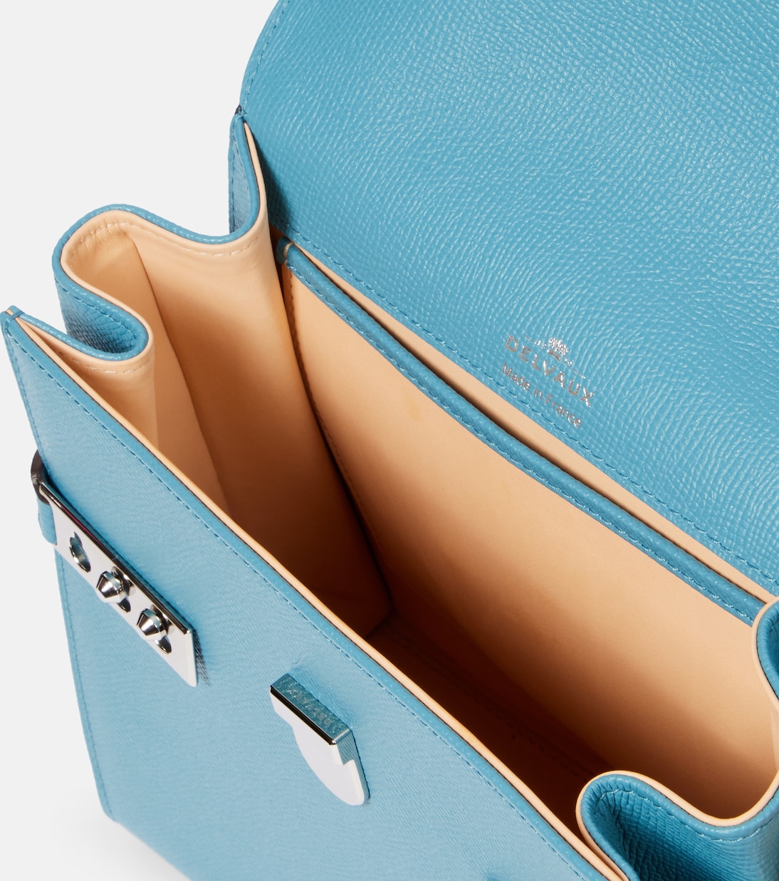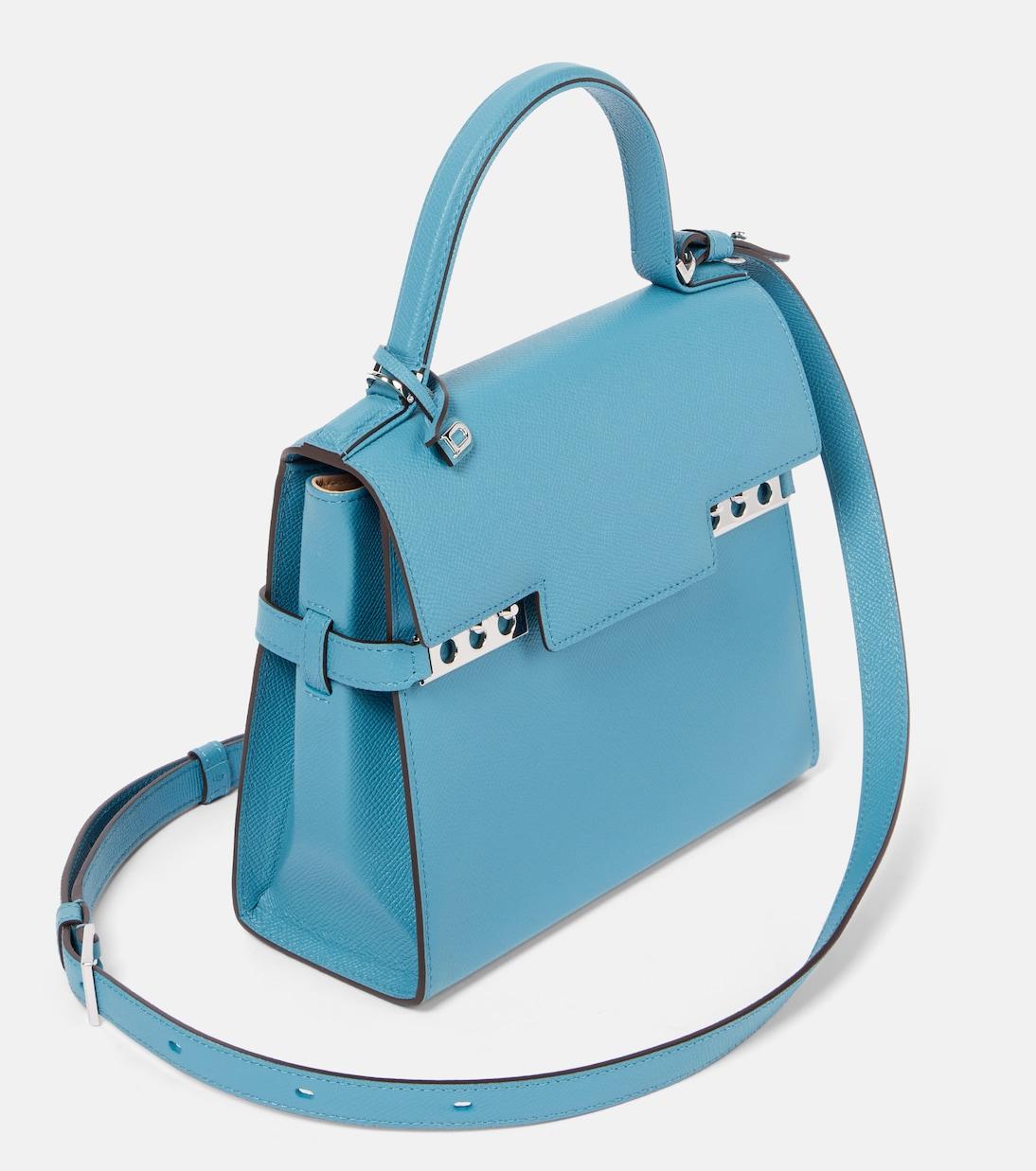 Сумка Tempête, вдохновленная трапецией парусника, отличается элегантными линиями, утонченным силуэтом и культовыми застежками с заклепками. Эта сумка Tempête Medium, изготовленная из телячьей кожи Derby Calf от Delvaux, представлена в цвете «бассейн» (бассейн) с серебристой фурнитурой и фирменными застежками с заклепками на переднем клапане.
