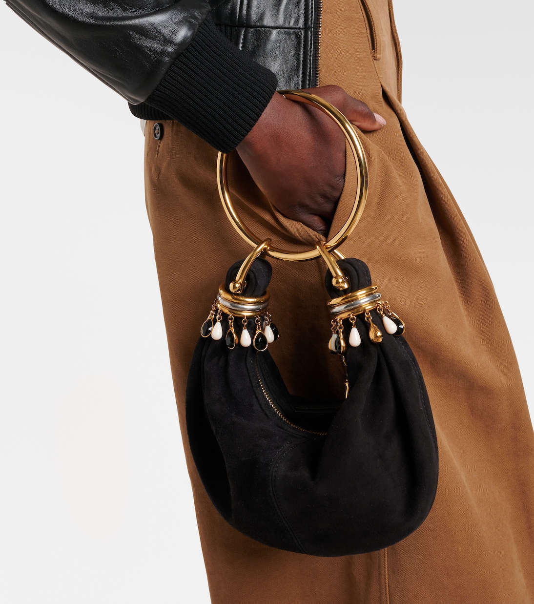 Сумка через плечо Bracelet Small от Chloé, вдохновленная архивами бренда, имеет округлую форму и золотистую металлическую ручку. Модель выполнена из замши и украшена изысканной отделкой по бокам.