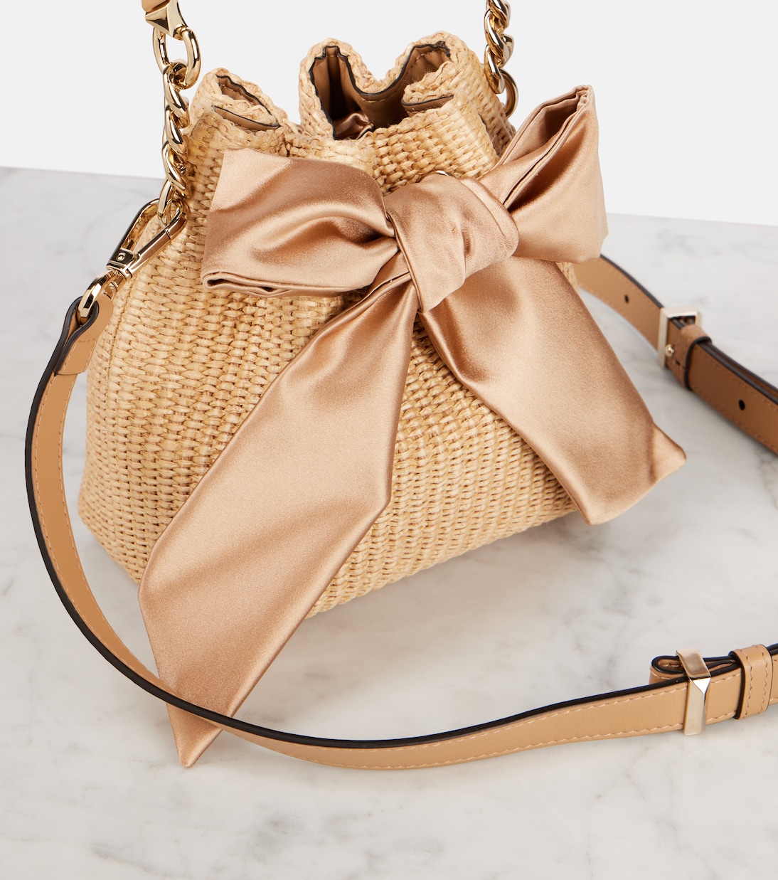 Сумка-ведро Bon Bon от Jimmy Choo, получившая меткое название, – воплощение настоящей конфеты на руку. Сделано в Италии, плетеная рафия украшена эффектным атласным бантом и имеет структурированную верхнюю ручку.