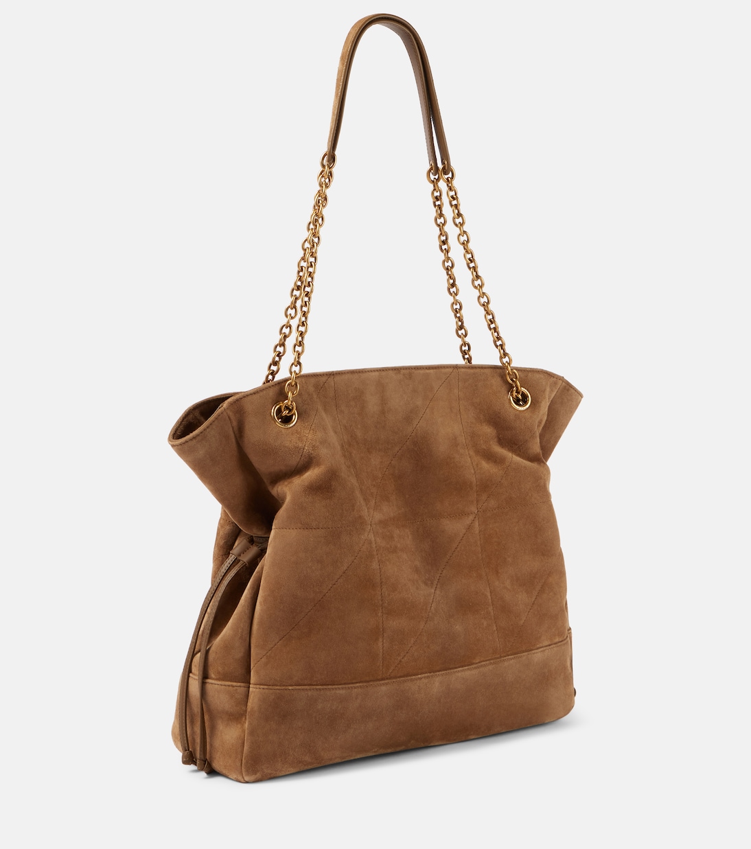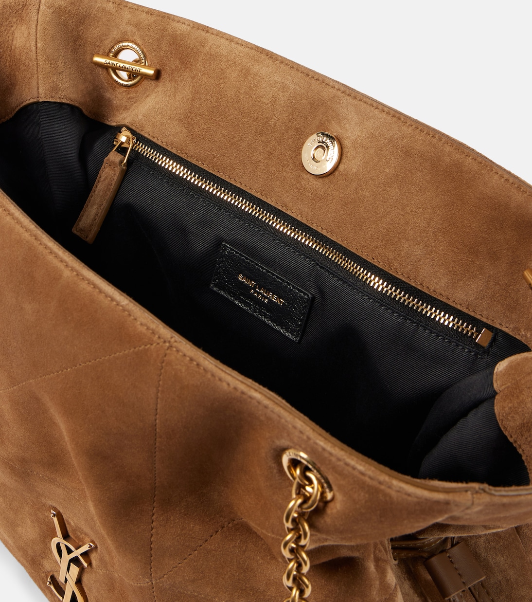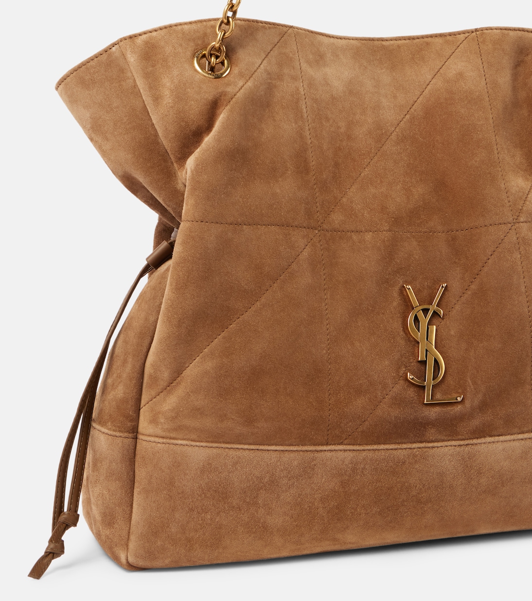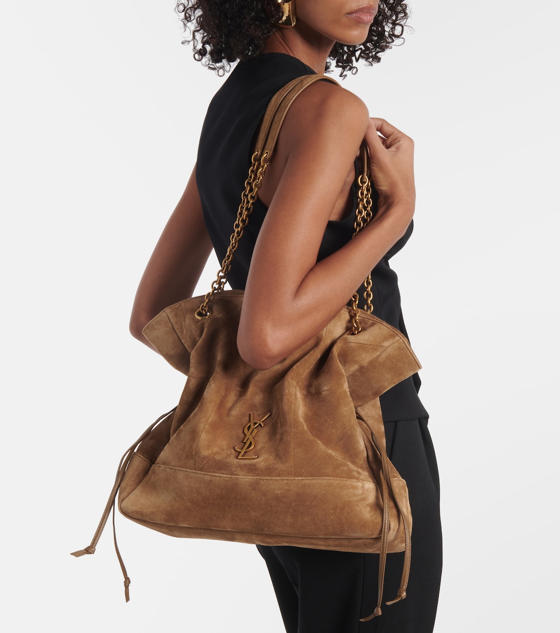 Сумка-тоут Jamie 4.3 Medium от Saint Laurent, названная в честь Джейми Бошер, представляет собой новую интерпретацию любимого стиля. Сумка выполнена из бархатистой гладкой замши, а её свободный крой остаётся верным фирменным кодам бренда: цепочка Le Maillon, монограмма YSL и лоскутная конструкция, вдохновлённая речным узлом Carré River Gauche.