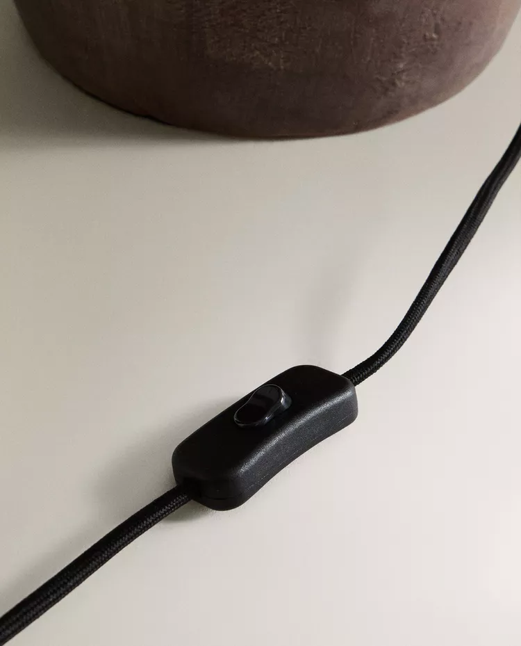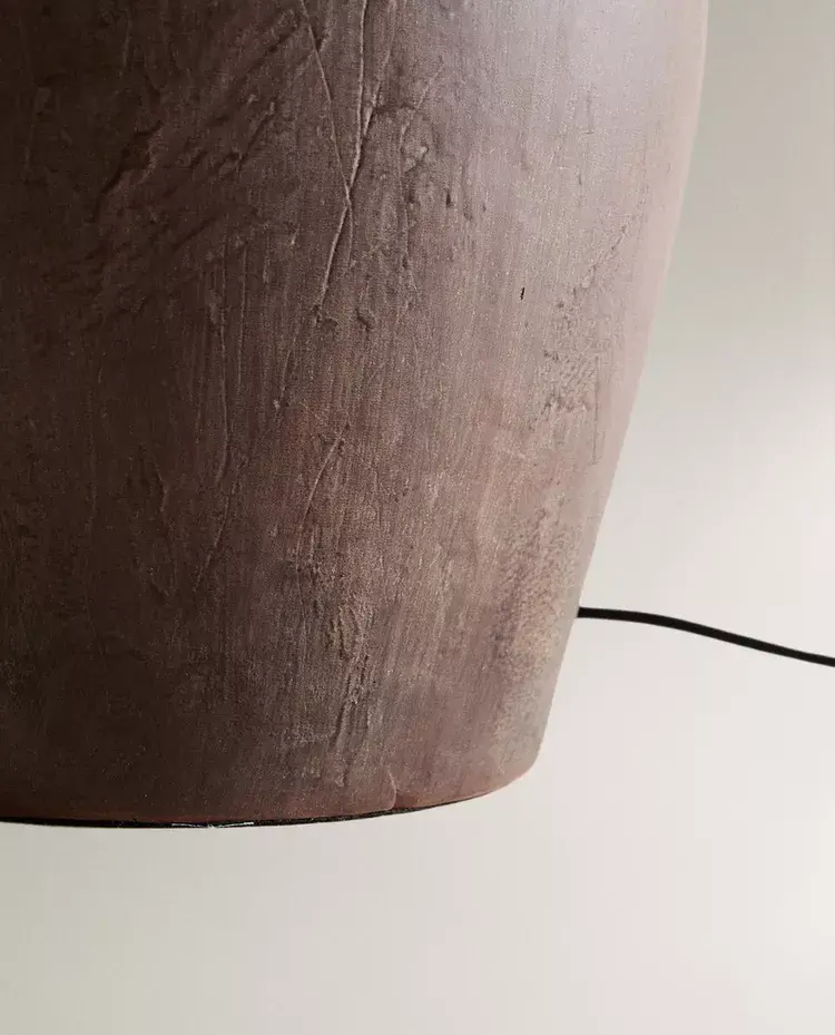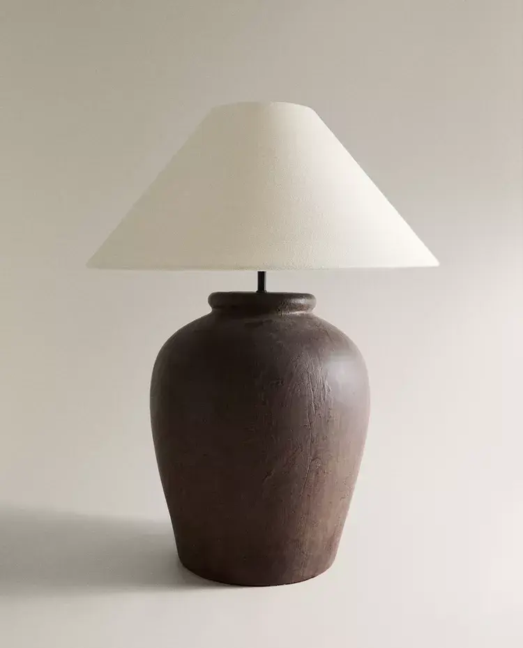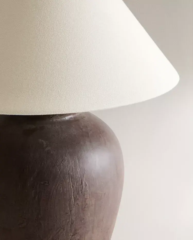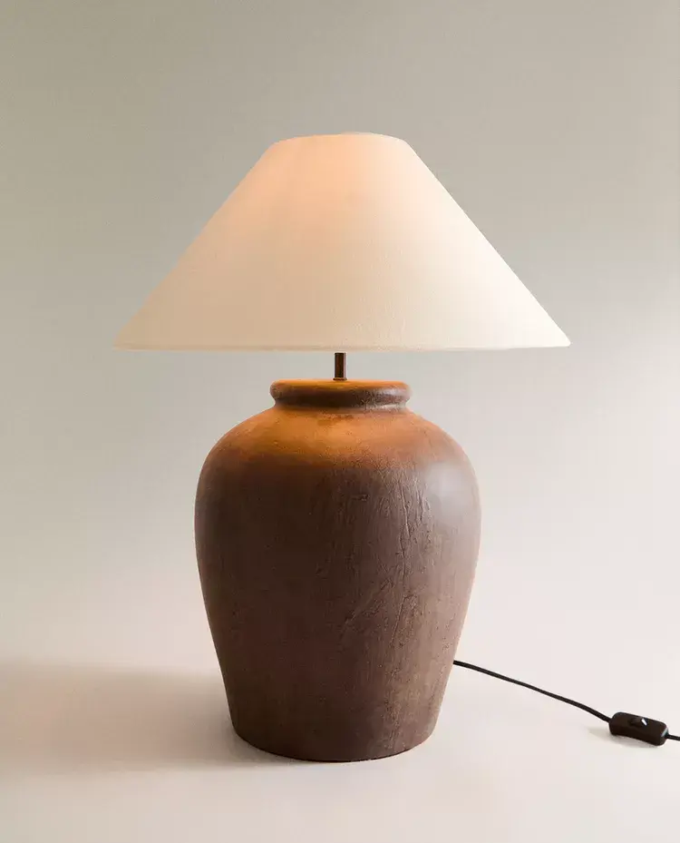Лампа с керамическим основанием и конусообразным льняным абажуром.
