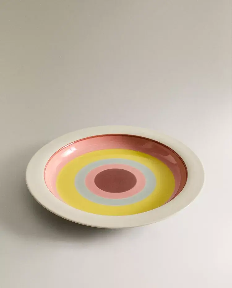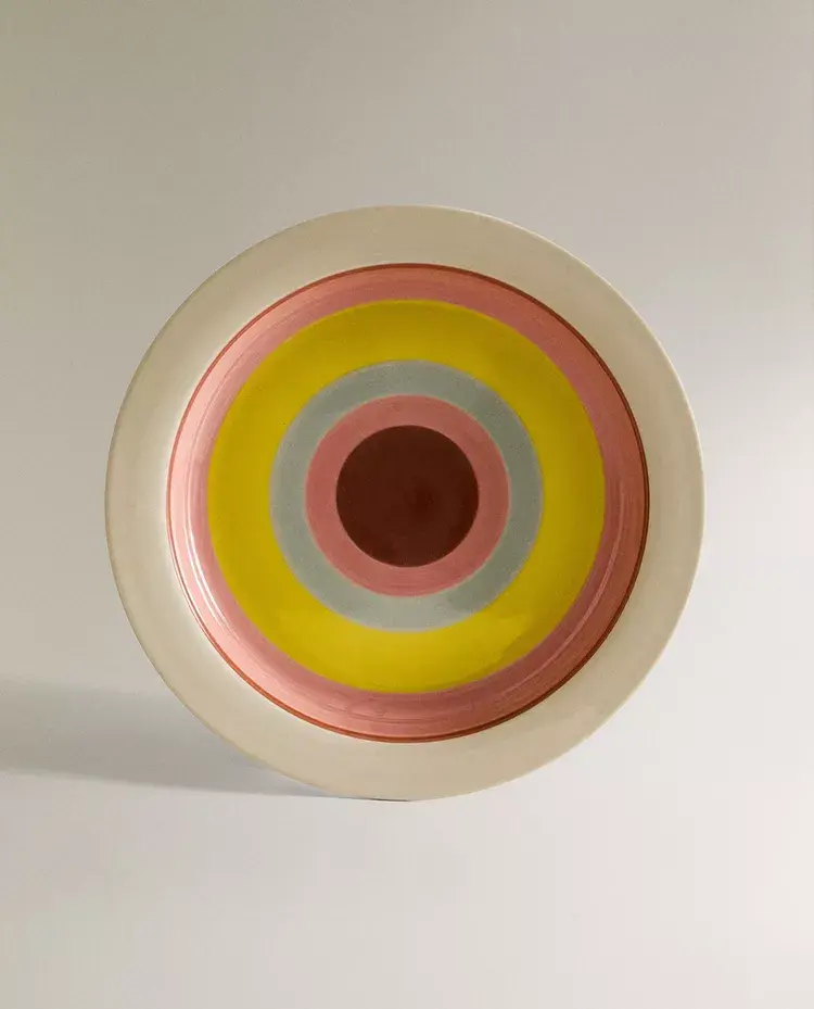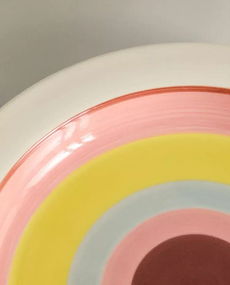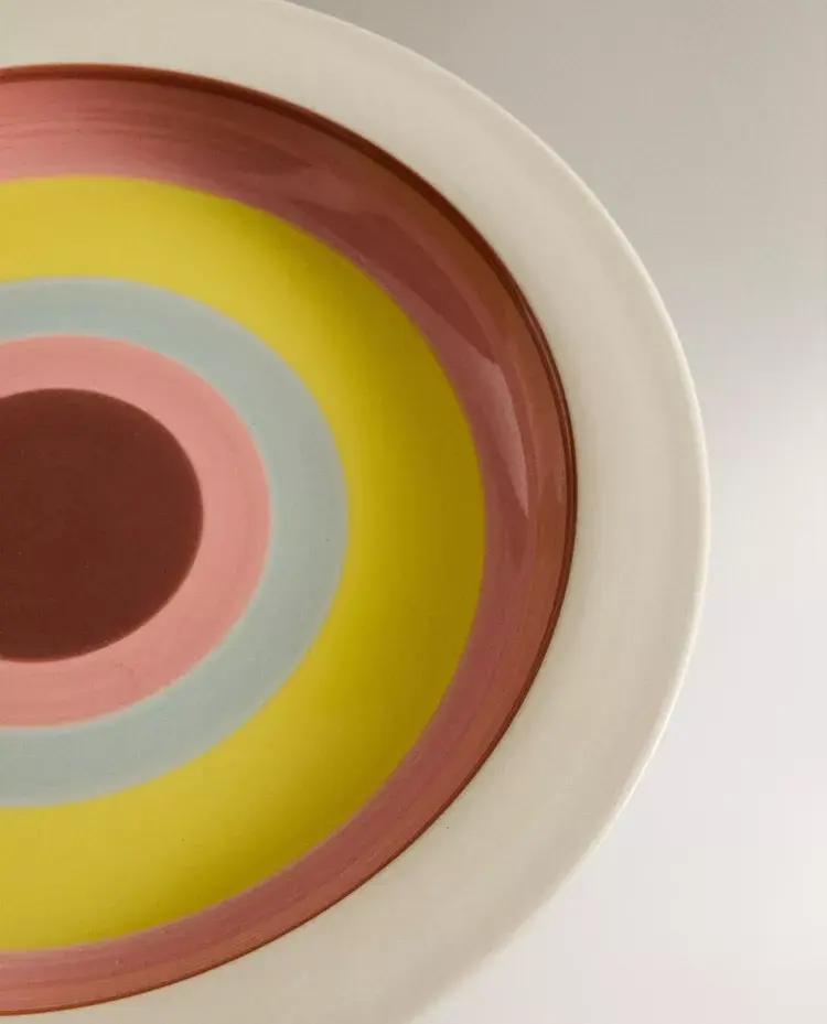 Круглое керамическое блюдо с разноцветным круговым узором.