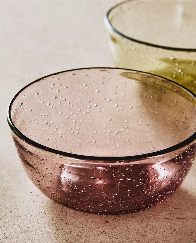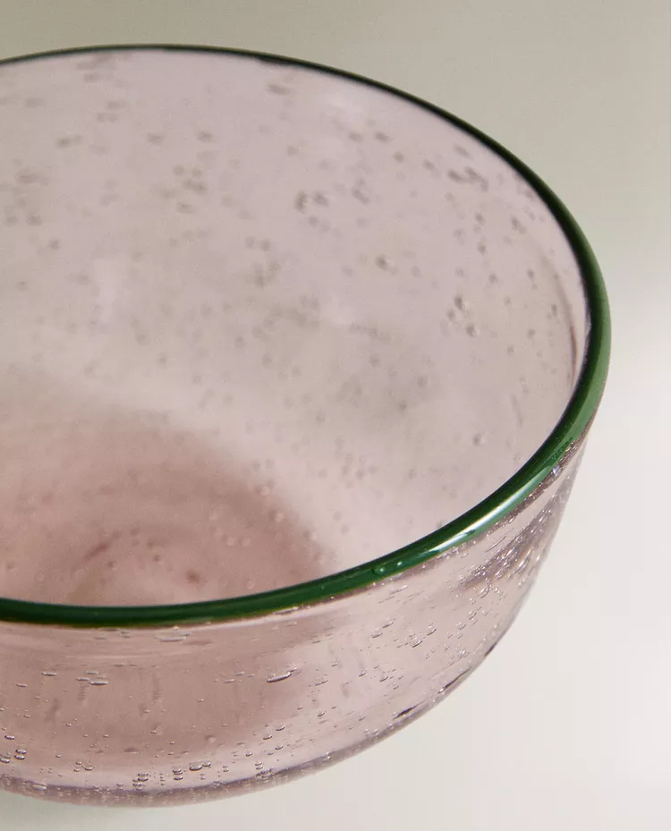 Стеклянная чаша с пузырьковым рисунком и контрастной каймой.