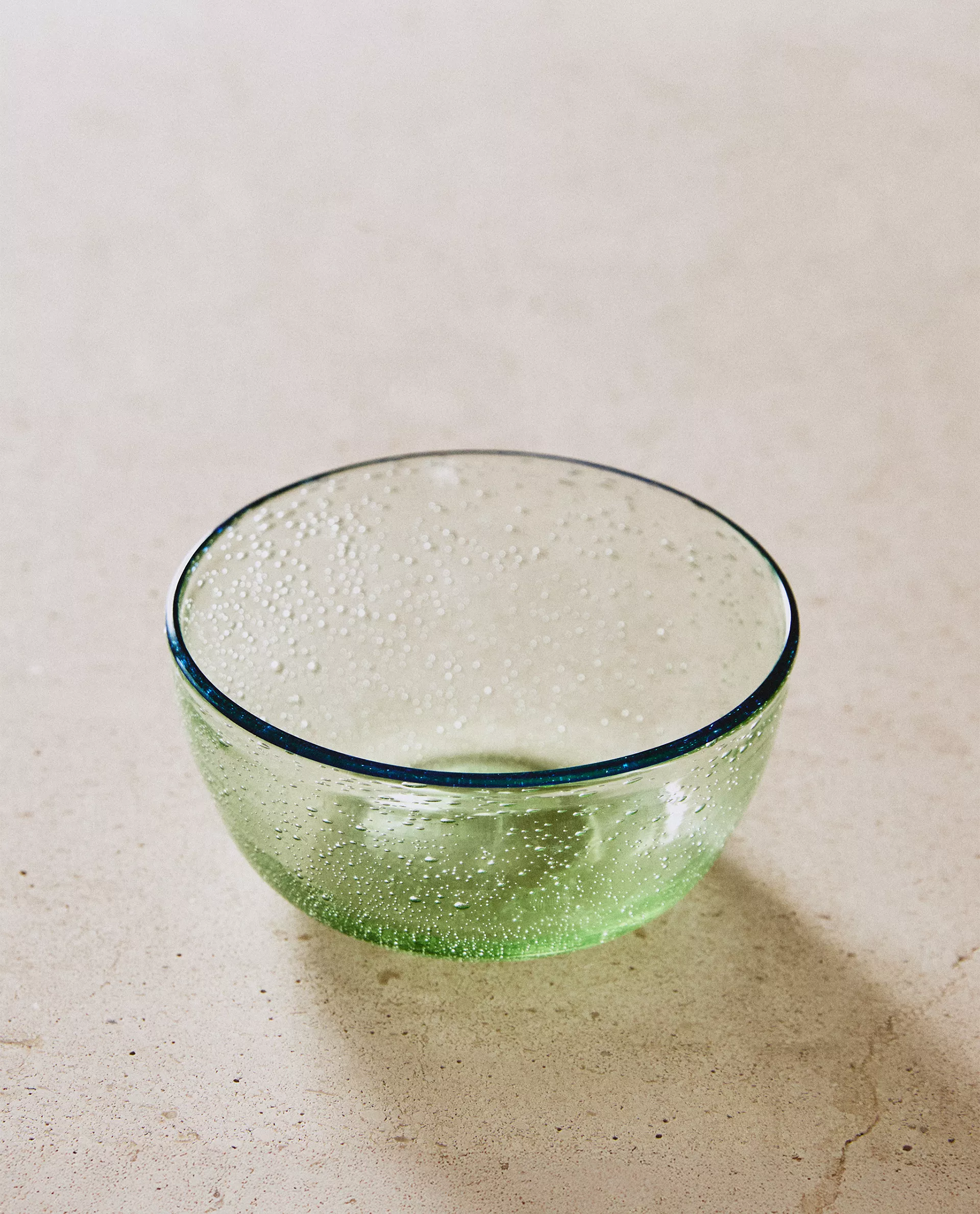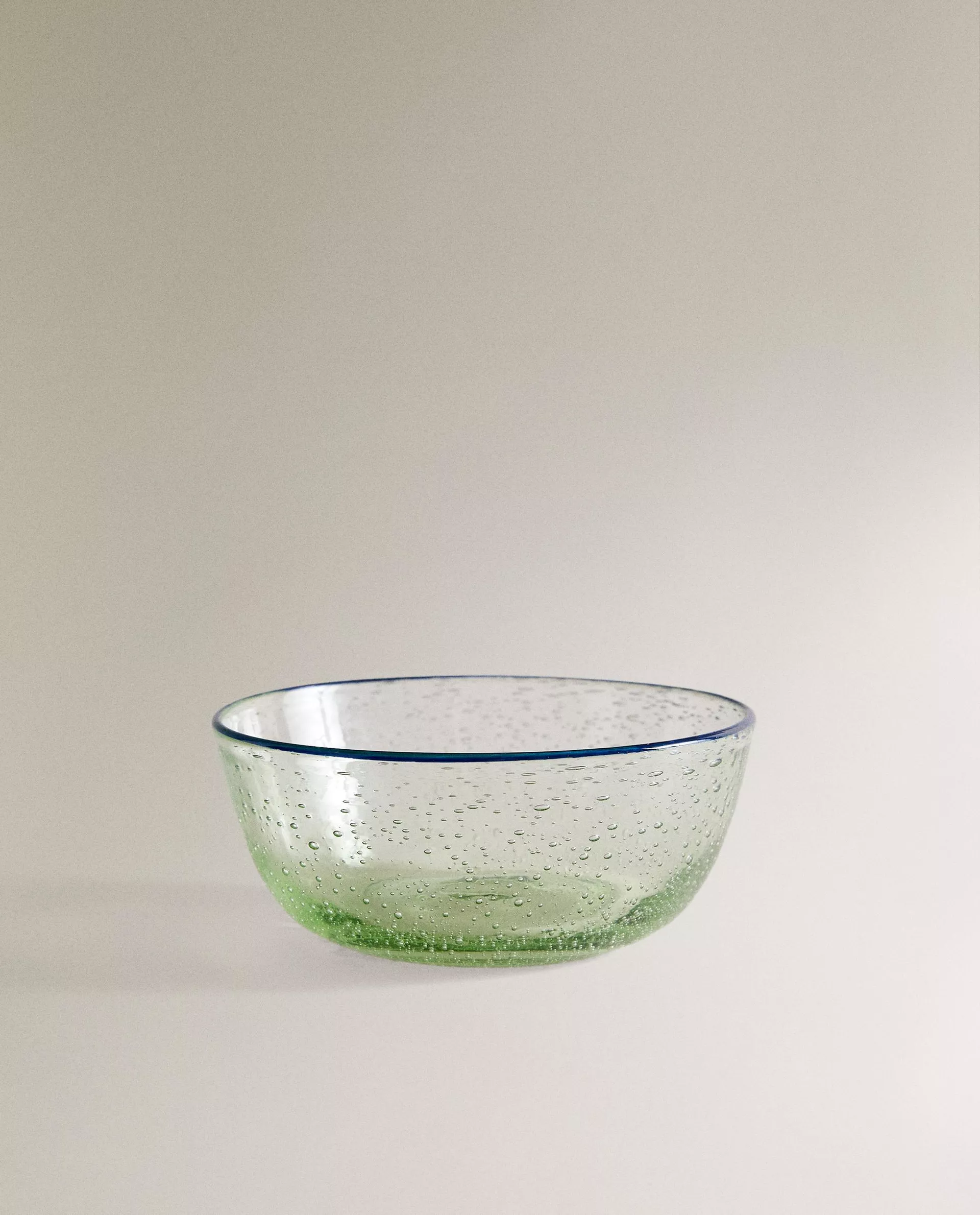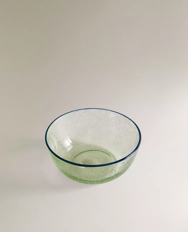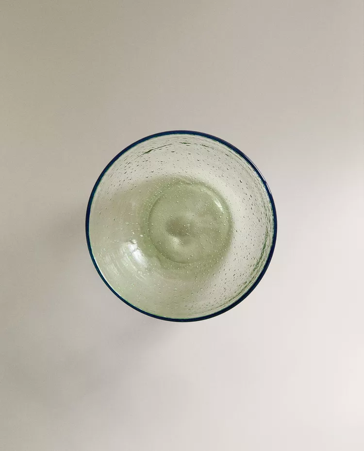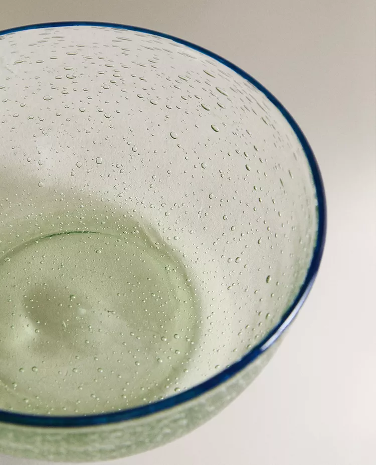 Стеклянная чаша с пузырьковым рисунком и контрастной каймой.